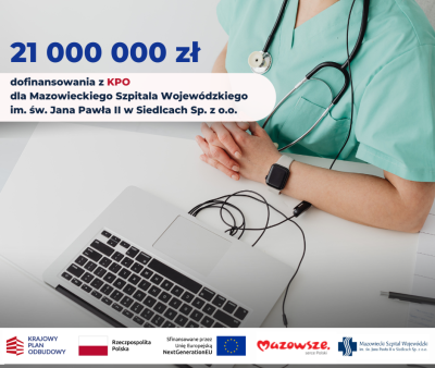 Mazowiecki Szpital Wojewódzki im. św. Jana Pawła II w Siedlcach Sp. z o.o. uprzejmie informuje, że w ramach Inwestycji D1.1.2 Przyspieszenie procesów transformacji cyfrowej ochrony zdrowia poprzez dalszy rozwój usług cyfrowych w ochronie zdrowia (nabór konkurencyjny) uzyskał dofinansowanie na realizację dwóch projektów: