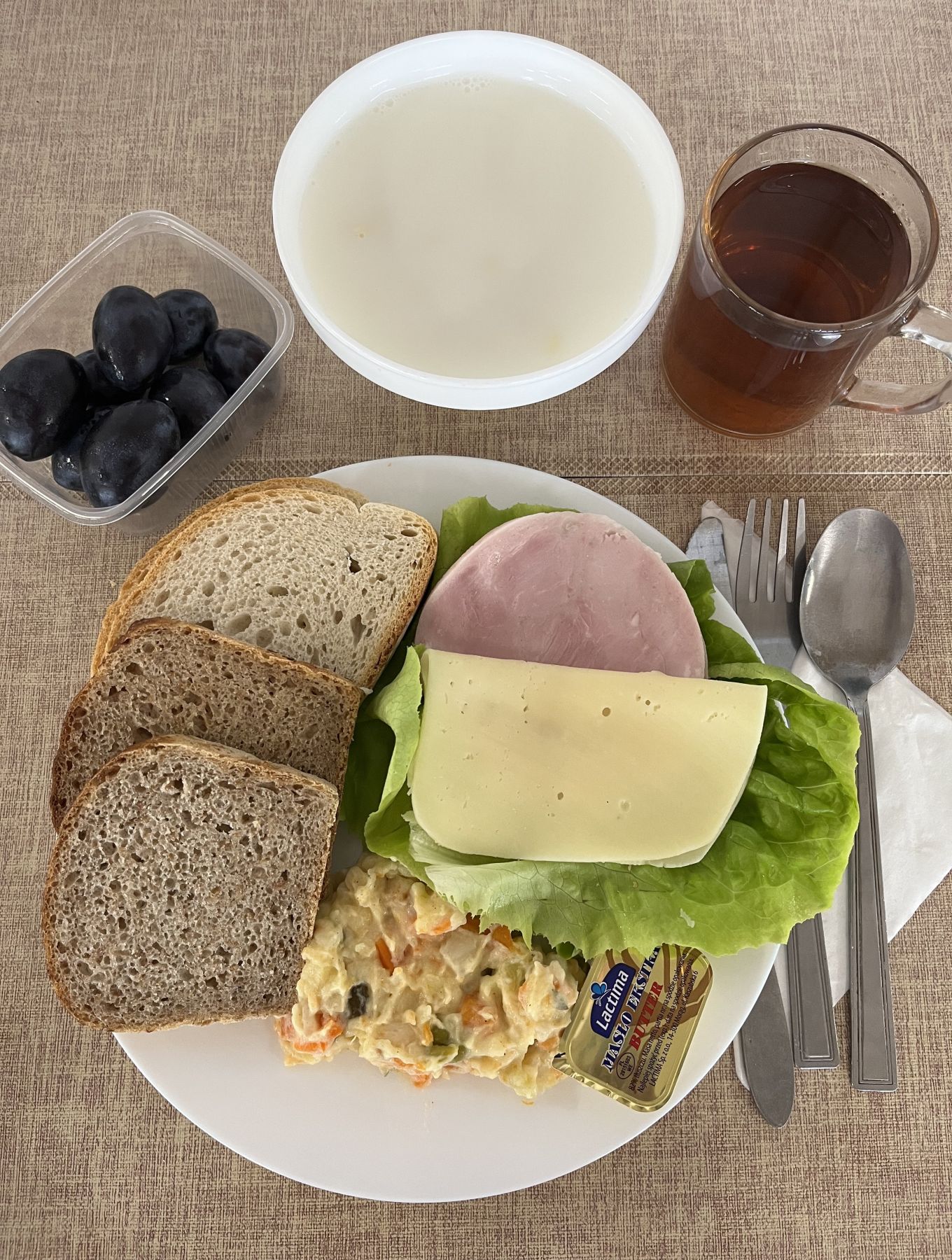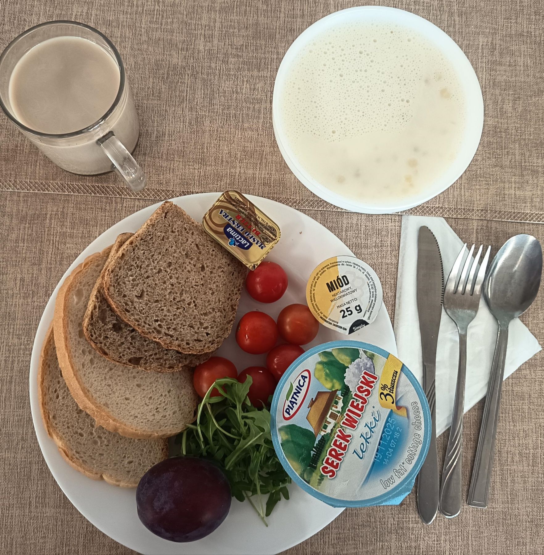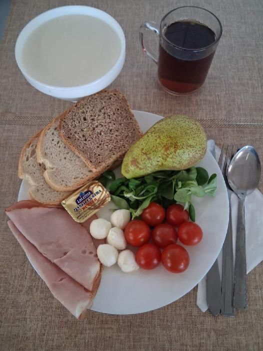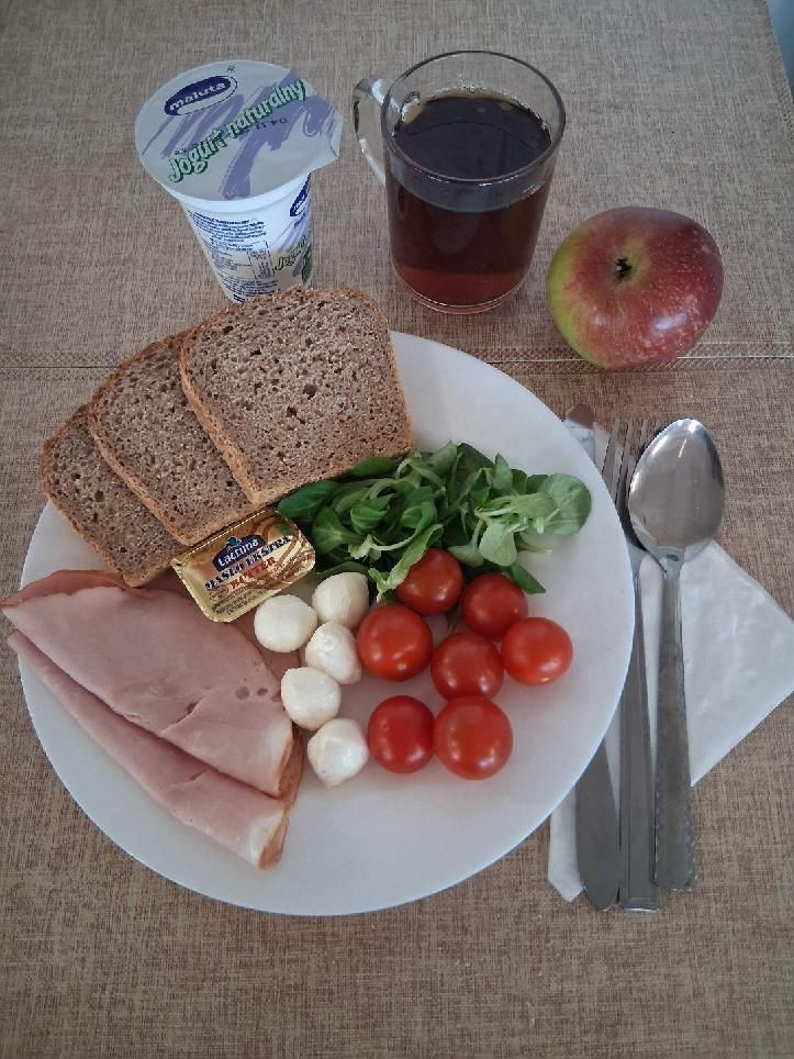 | DIETA PODSTAWOWA Płatki jęczmienne na mleku 300 ml (MLE, GLU JĘCZ) Chleb mieszany pszenno-żytni 70 g (GLU PSZ, GLU ŻYT) Chleb razowy żytnio-pszenny 50 g (GLU PSZ, GLU ŻYT) Masło extra 82% 10 g (MLE) Szynkowa drobiowa - produkt drobiowy, grubo rozdrob., wędzony, parzony 30 g Serek a'la fromage z ziołami 80 g (MLE) Sałata zielona 20 g Pomidor 50 g Herbata czarna granulowana z/c 250 ml Jabłko 150 g |