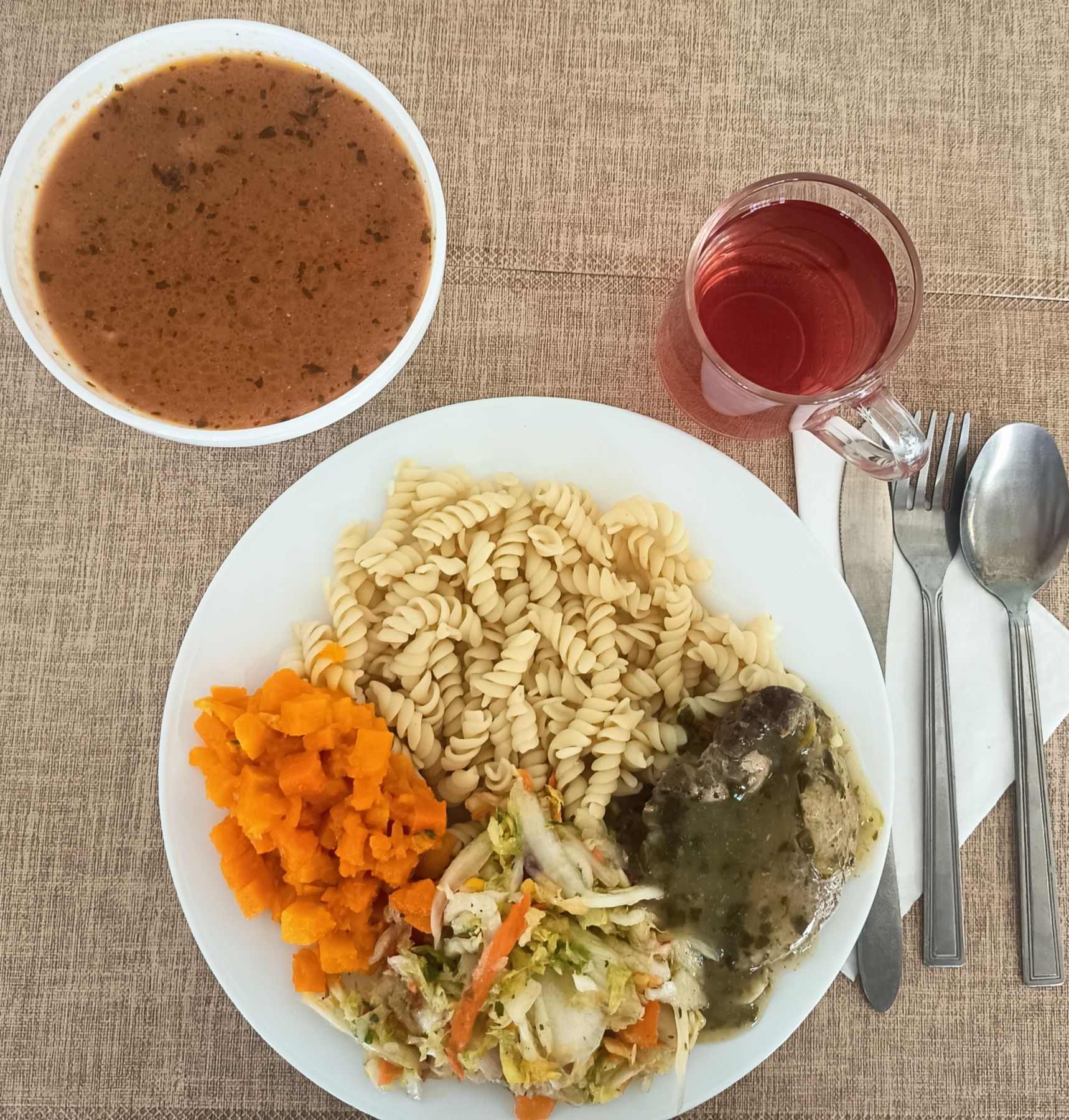 | DIETA PODSTAWOWA Barszcz ukraiński z ziemniakami 300 ml (GLU PSZ, MLE, SEL) Makaron z sosem mięsno-warzywnym, z mięsa drobiowego 300 g (GLU PSZ, SEL) Surówka wielowarzywna z olejem 200 g (SEL) Kompot z aronii i czerwonej porzeczki z/c 250 ml |
