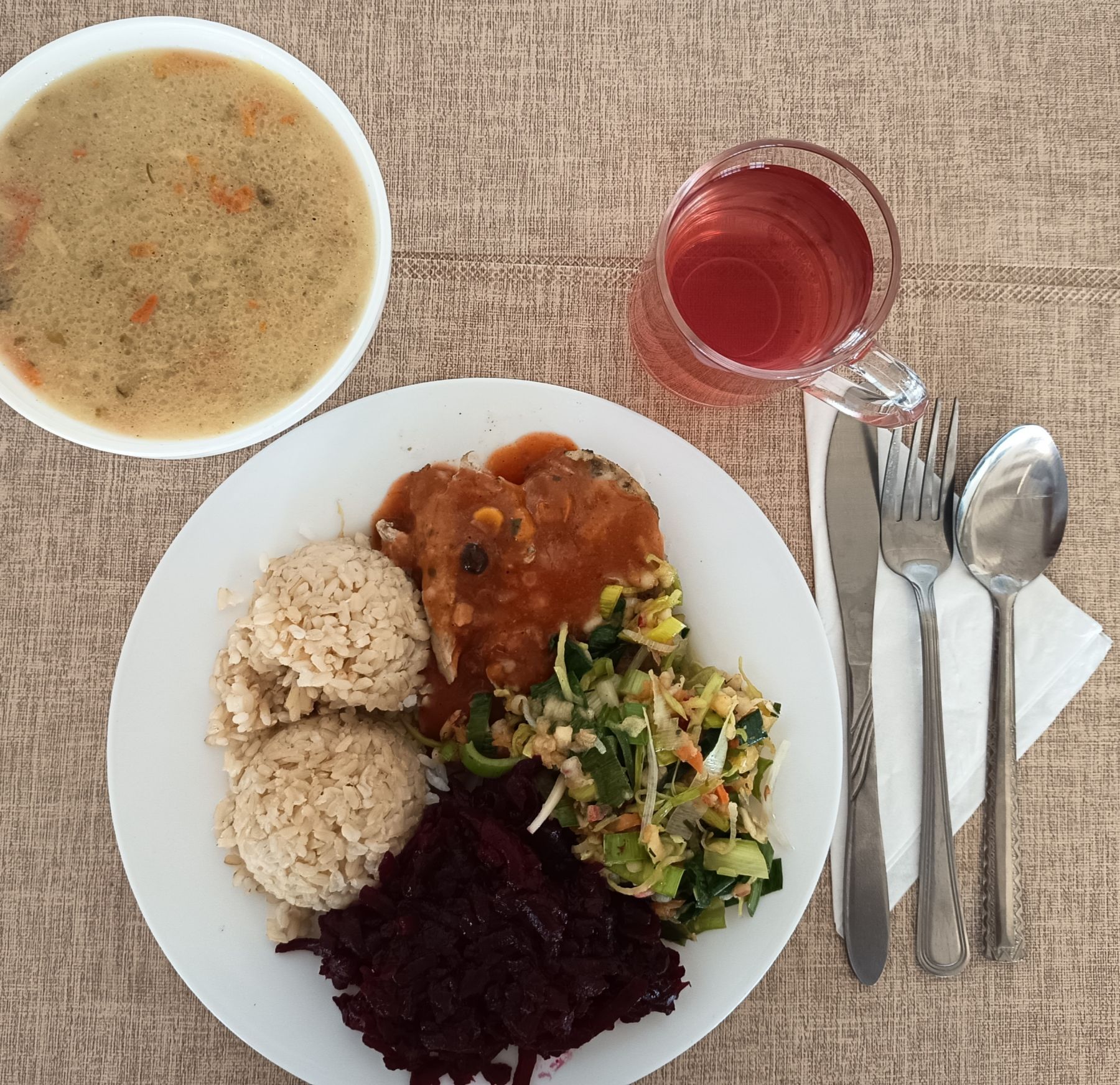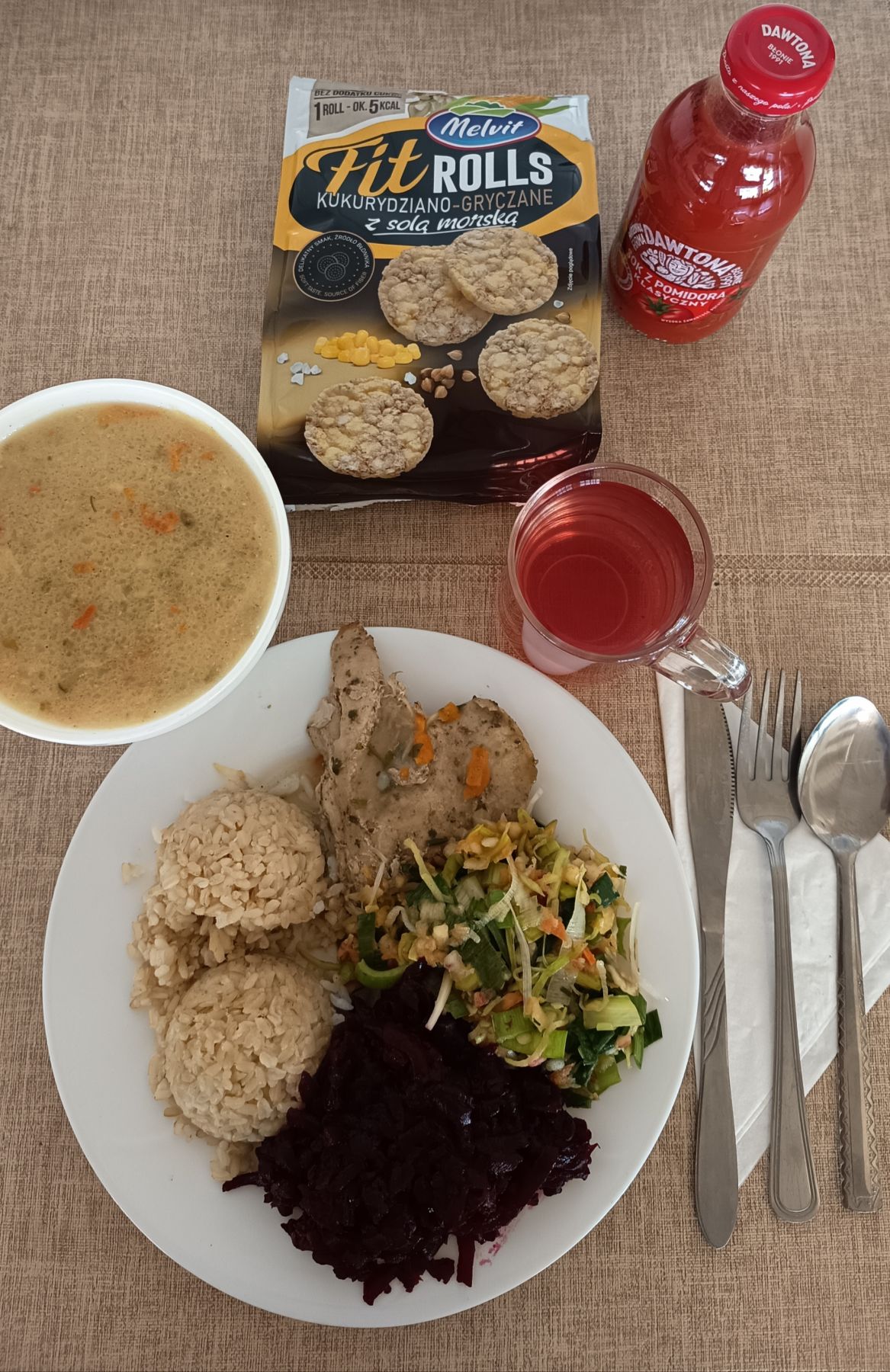 Risotto (ryż brązowy) z mięsem wieprzowym i warzywami 300 g (SEL) Ogórek kiszony z cebulką i olejem 200 g Kompot z aronii i czerwonej porzeczki b/c 250 ml |