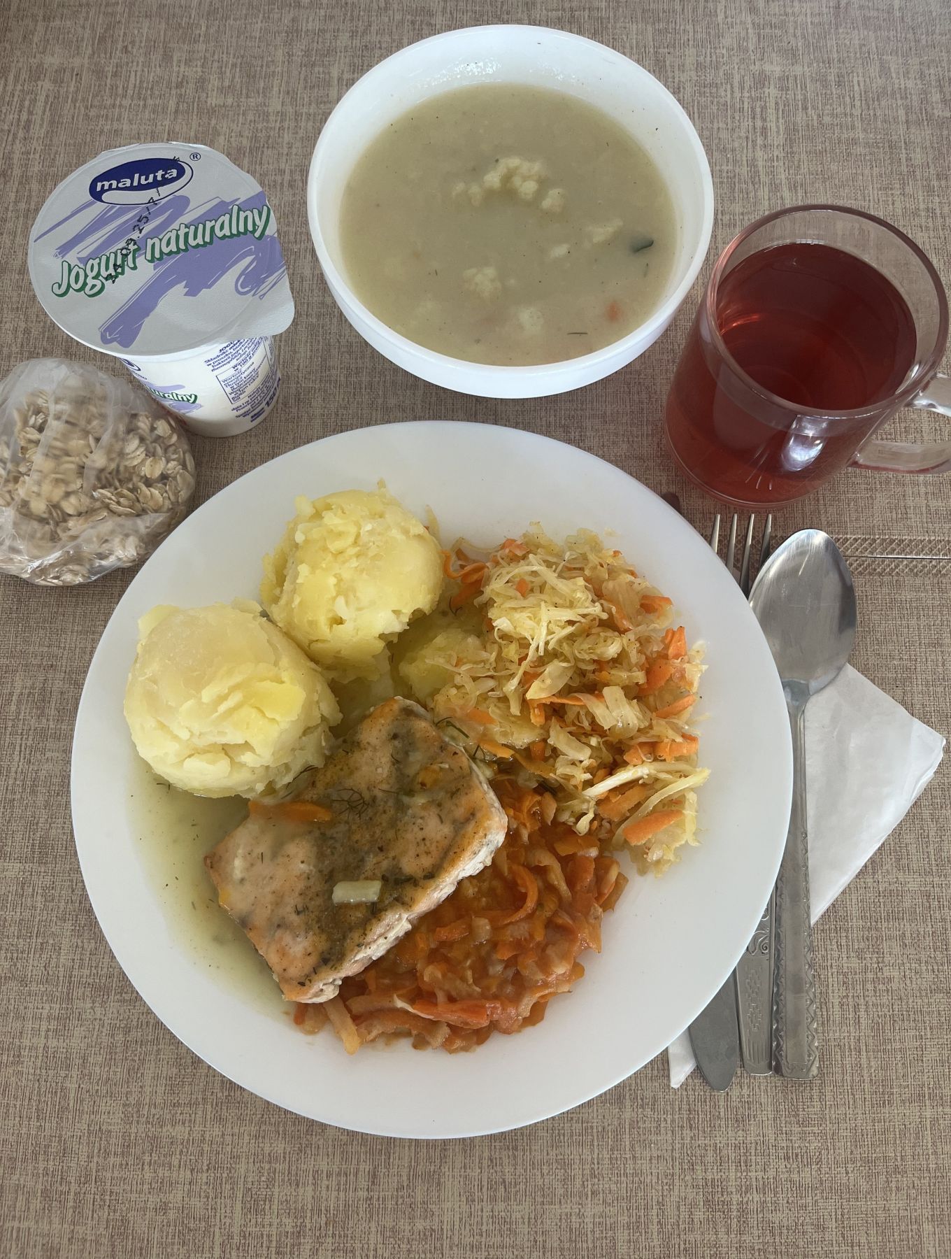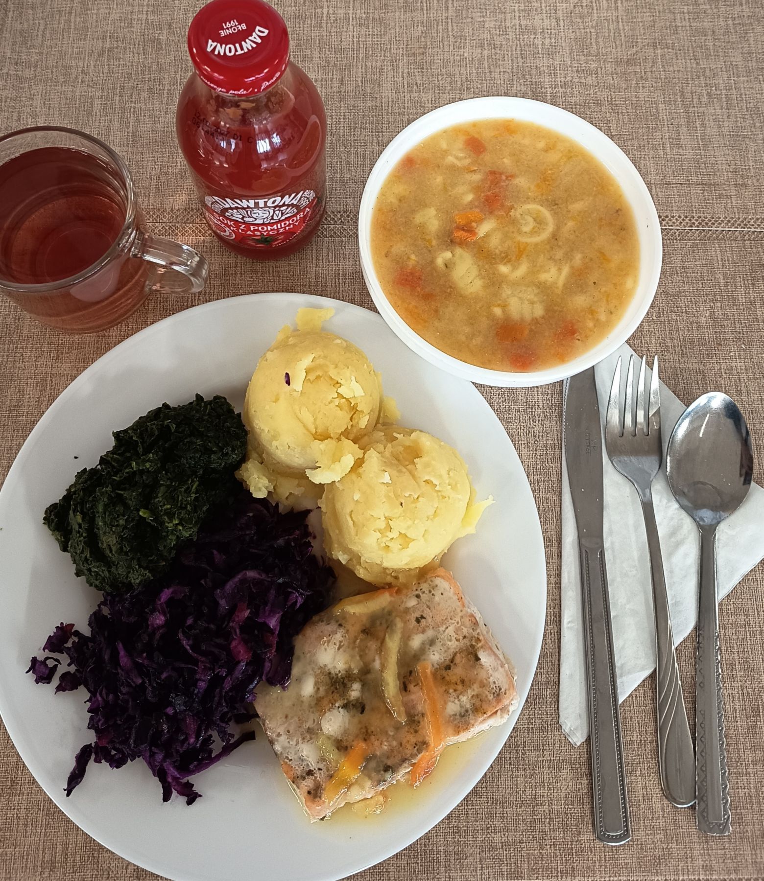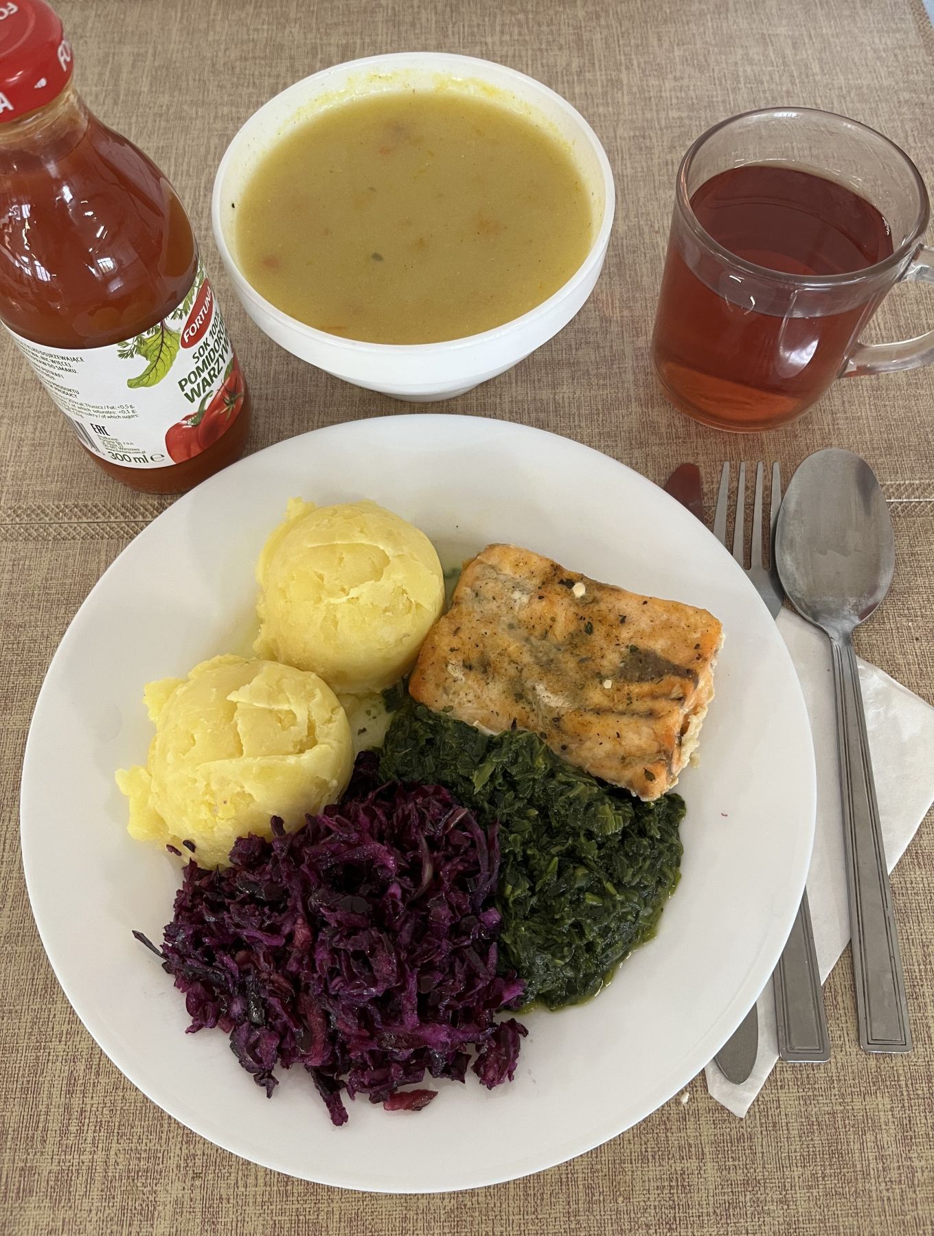 Ziemniaki 180 g Ryba pieczona (Morszczuk) 120 g (RYB) Surówka z kapusty kiszonej z olejem 200 g Kompot z aronii i czerwonej porzeczki b/c 250 ml |