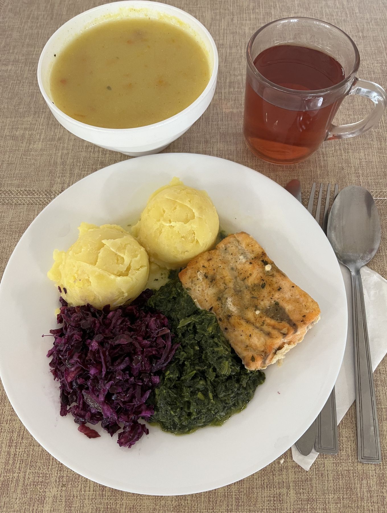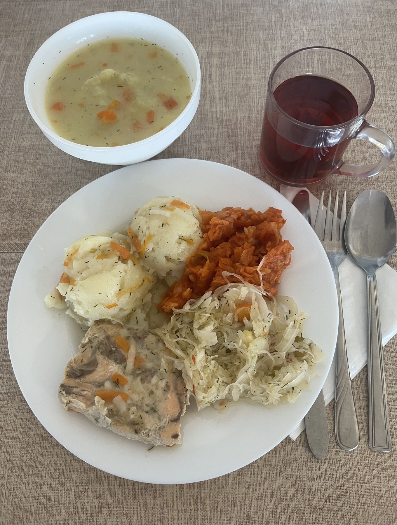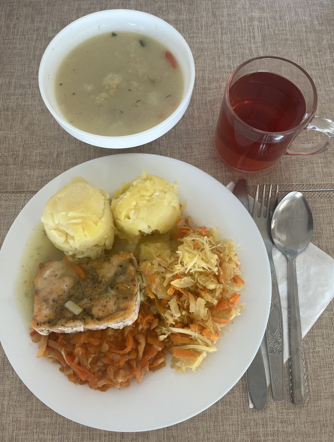 Ziemniaki 180 g Ryba pieczona (Morszczuk) 120 g (RYB) Surówka z kapusty kiszonej z olejem 200 g Kompot z aronii i czerwonej porzeczki b/c 250 ml |