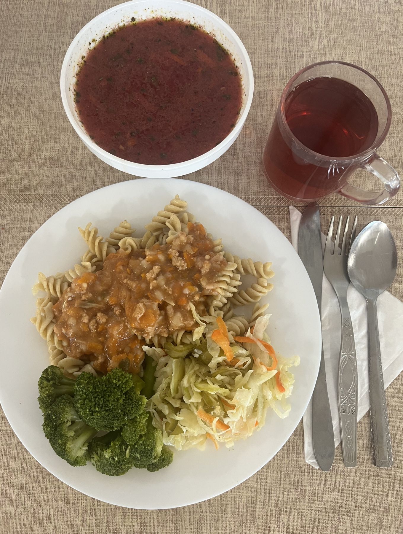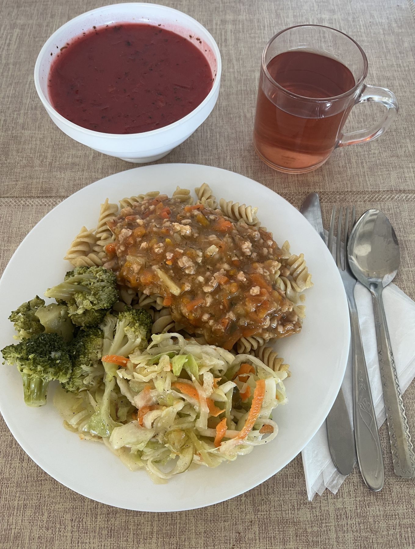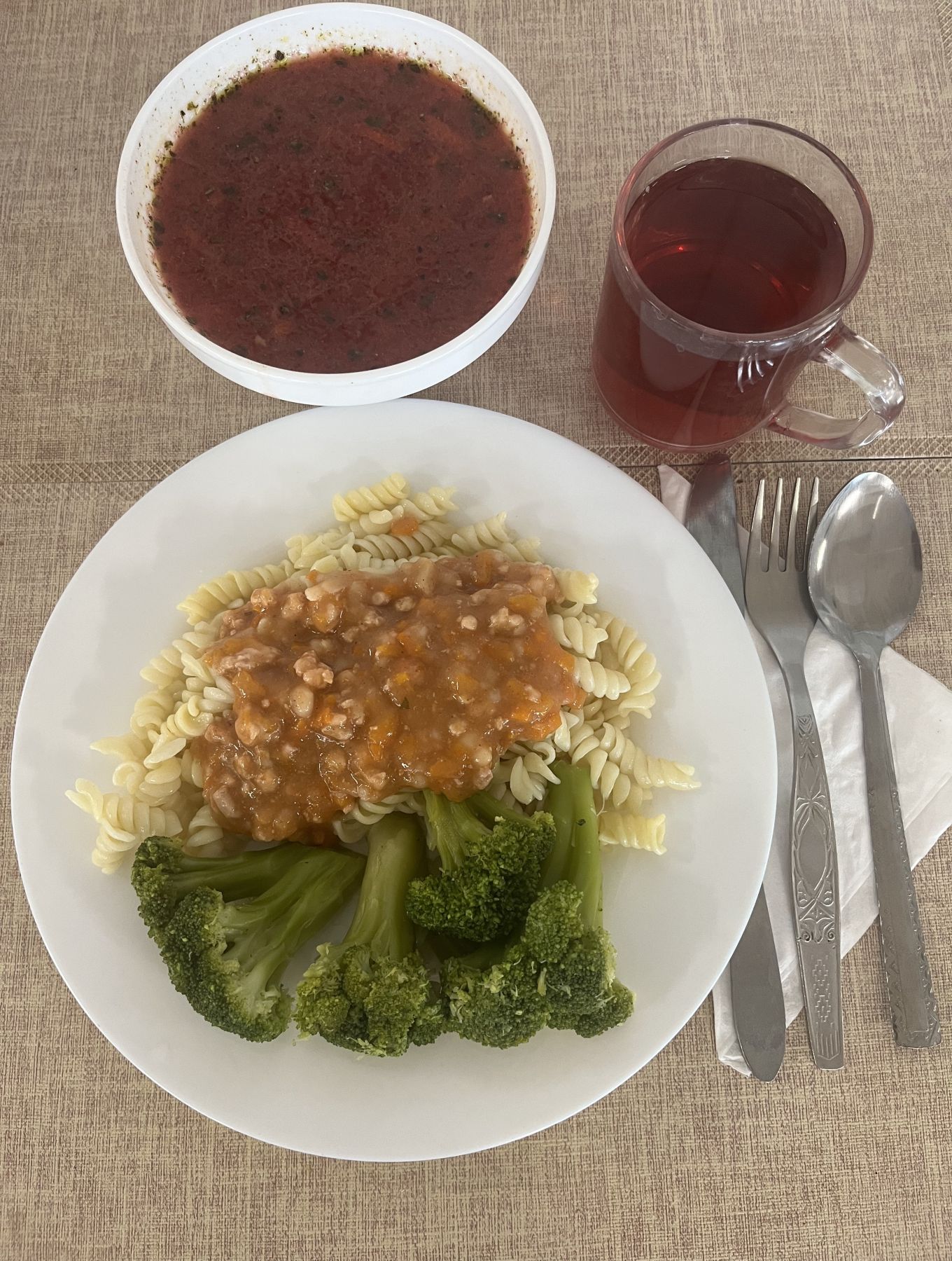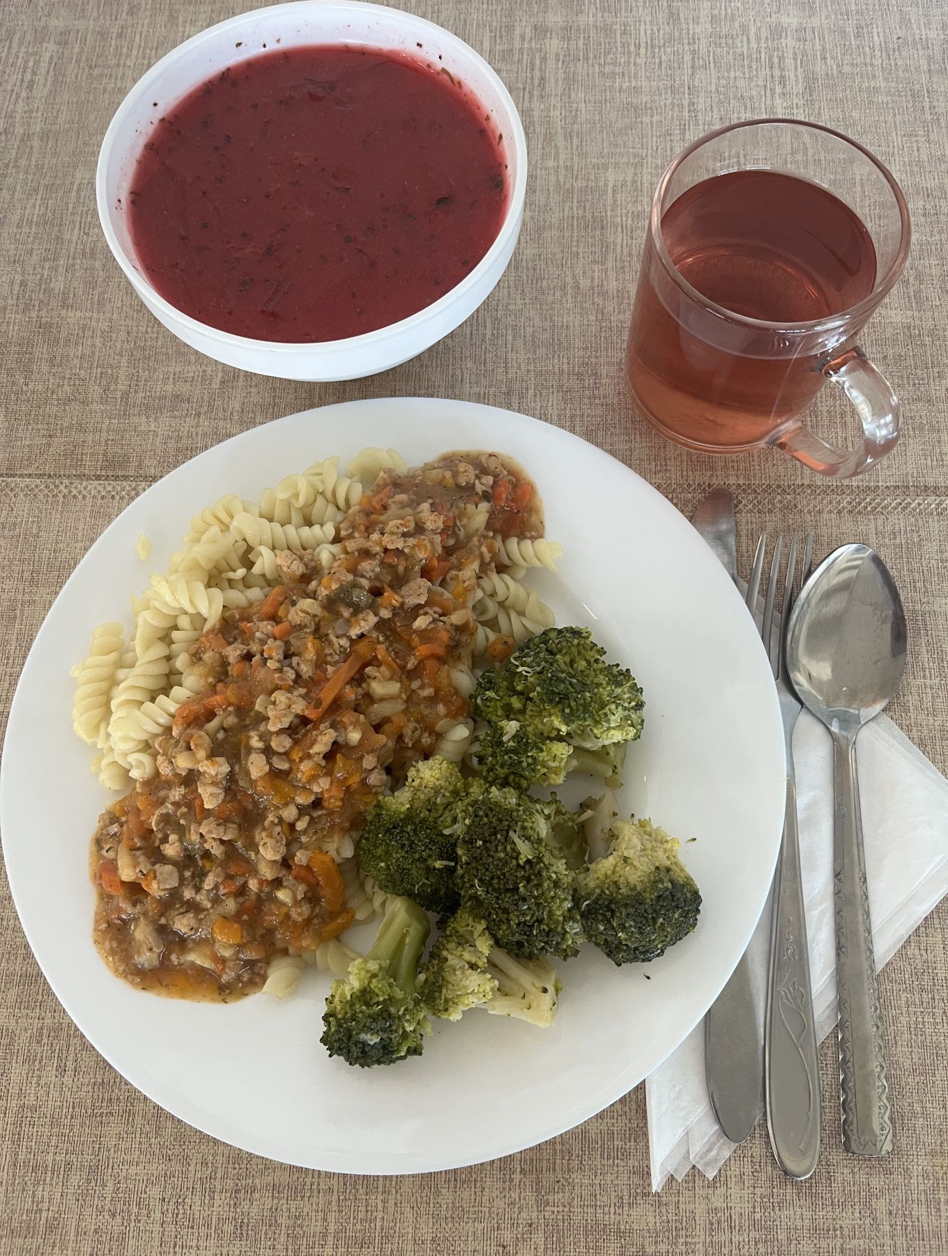 Makaron z sosem mięsno-warzywnym, z mięsa drobiowego 300 g (GLU PSZ, SEL) Brokuł gotowany 200 g (SEL) Kompot z aronii i czerwonej porzeczki z/c 250 ml |