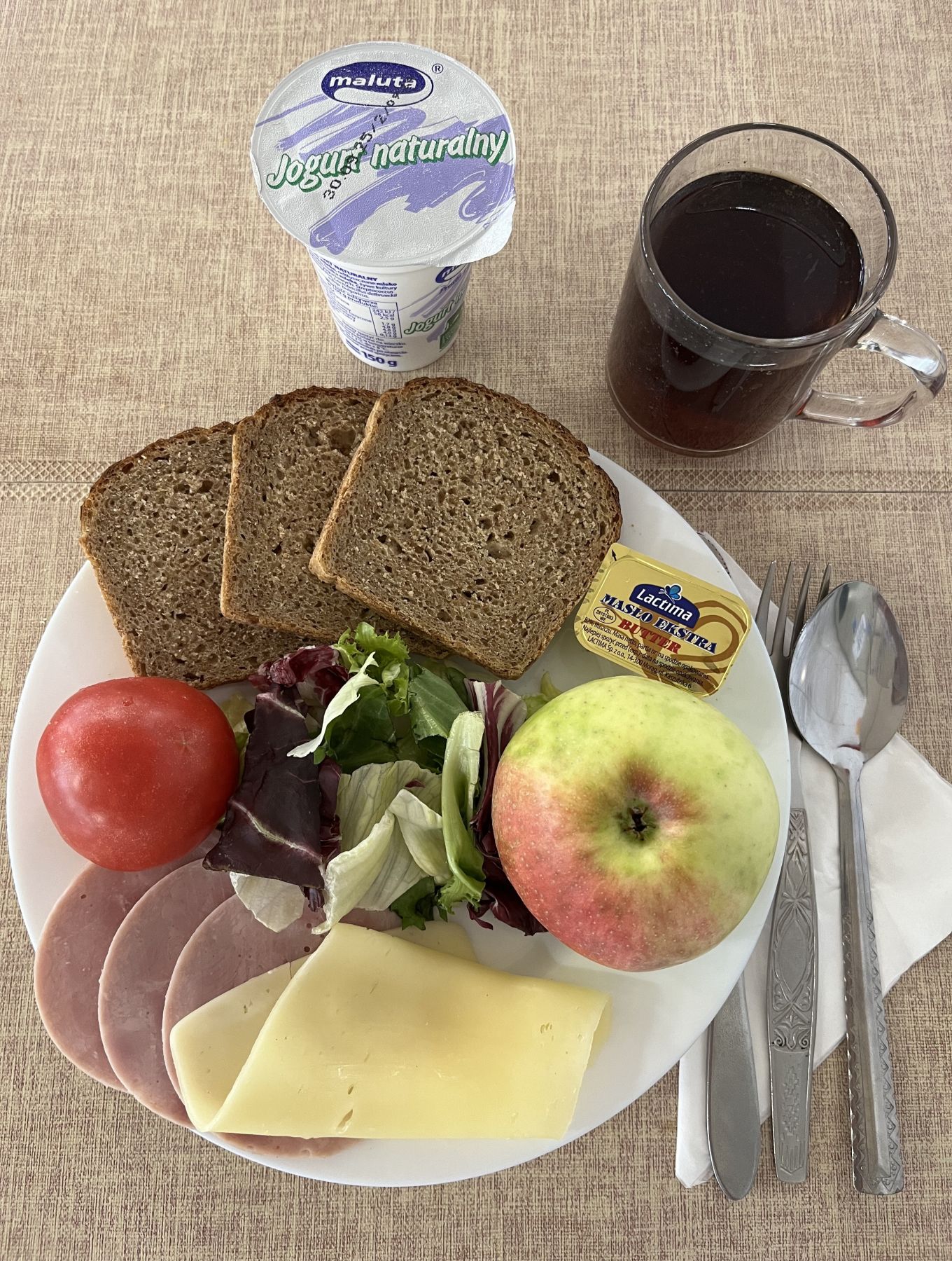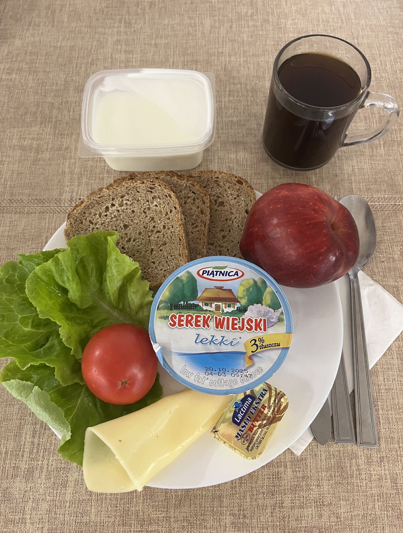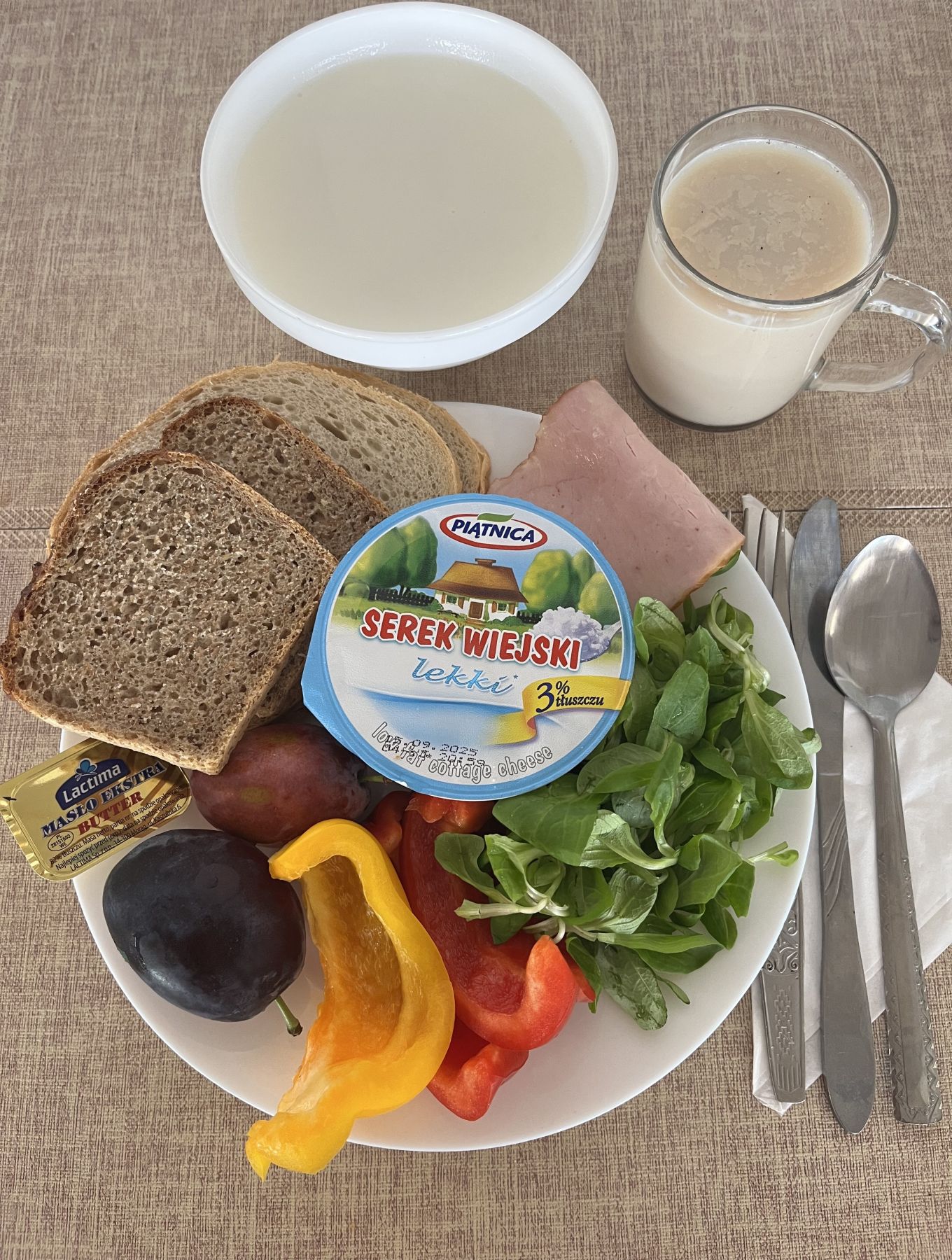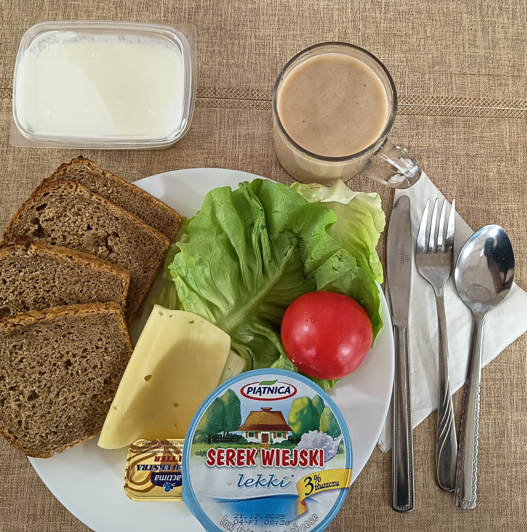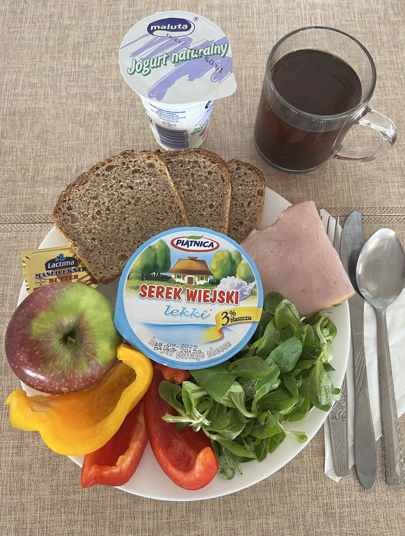 Jogurt naturalny 150 g 1 szt (MLE) Chleb razowy żytnio-pszenny 120 g (GLU PSZ, GLU ŻYT) Masło extra 82% 10 g (MLE) Serek homogenizowany naturalny 50 g (MLE) Szynkowa dębowa kieł. wp. gr. rozd. wędz. parz. z dodatkiem wody w osł. niejad. 25 g Papryka świeża 70 g Kawa zbożowa 250 ml II Śniadanie