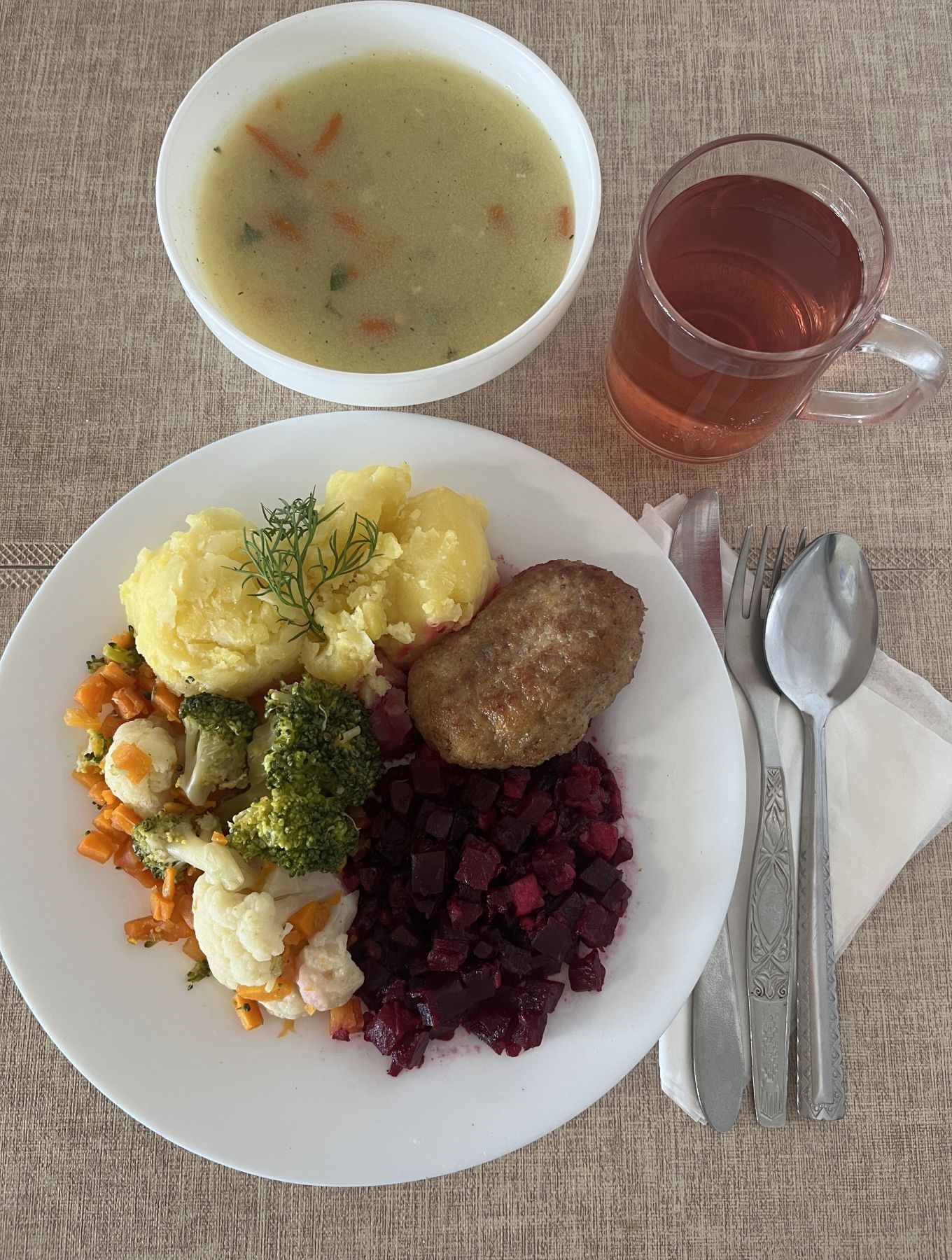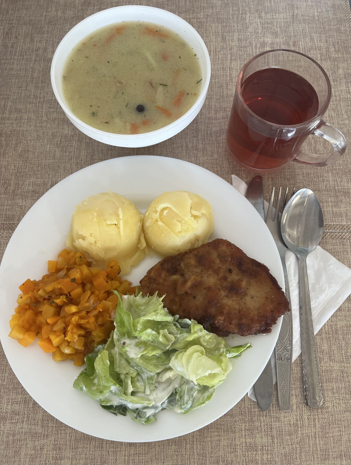 DIETA PODSTAWOWA Jarzynowa z zacierką 300 ml (GLU PSZ, JAJ, MLE, SEL) Ziemniaki 180 g Kotlet drobiowy panierowany 100 g (GLU PSZ, JAJ) Surówka wykwintna z olejem b/c 200 g (JAJ, GOR) Kompot z aronii i czerwonej porzeczki z/c 250 ml |