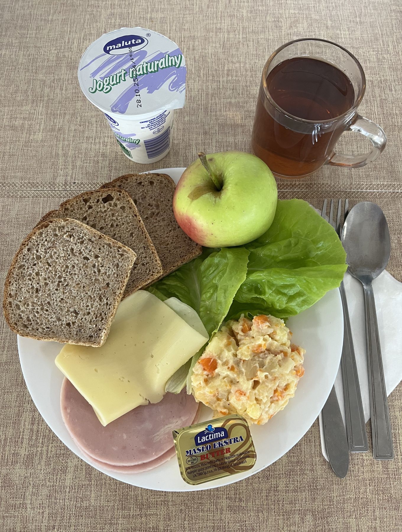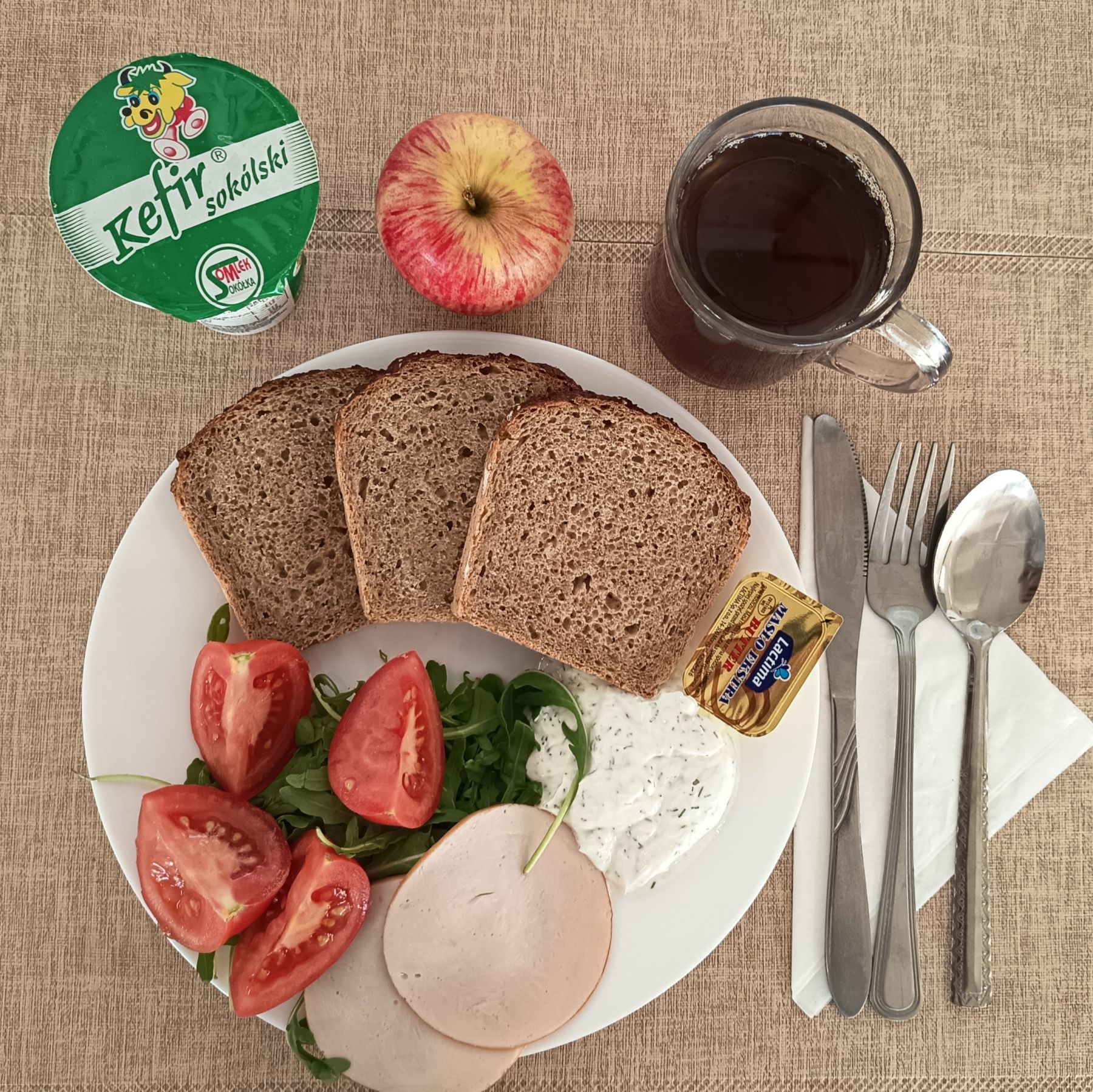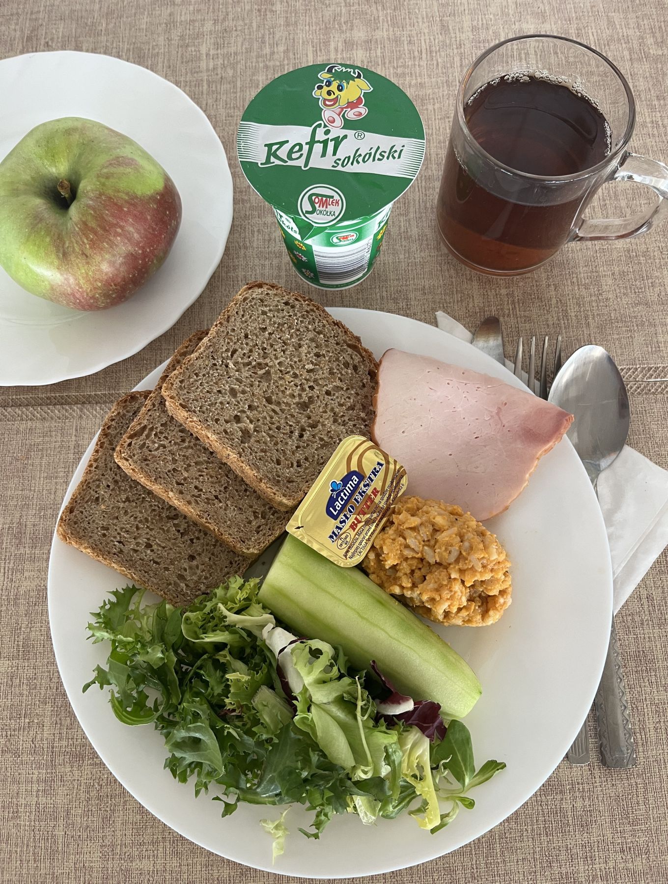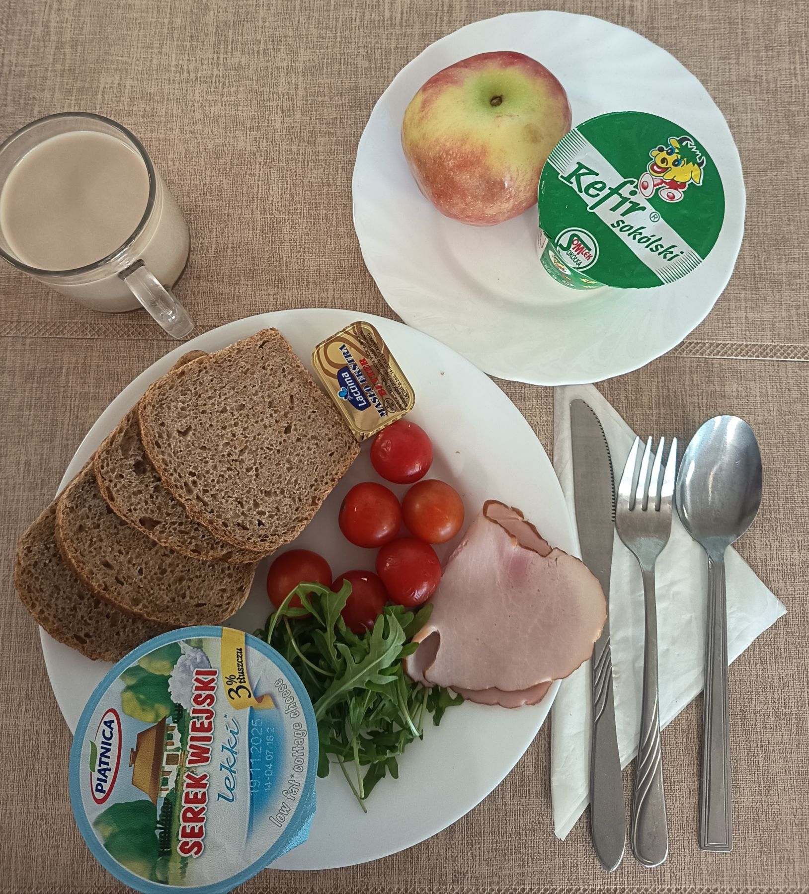 Kefir 2% tł 150 g 1 szt (MLE) Chleb razowy żytnio-pszenny 120 g (GLU PSZ, GLU ŻYT) Masło extra 82% 10 g (MLE) Szynkowa drobiowa - produkt drobiowy, grubo rozdrob., wędzony, parzony 30 g Serek a'la fromage z ziołami 80 g (MLE) Sałata zielona 30 g Herbata czarna granulowana b/c 250 ml II śniadanie Jabłko 150 g |
