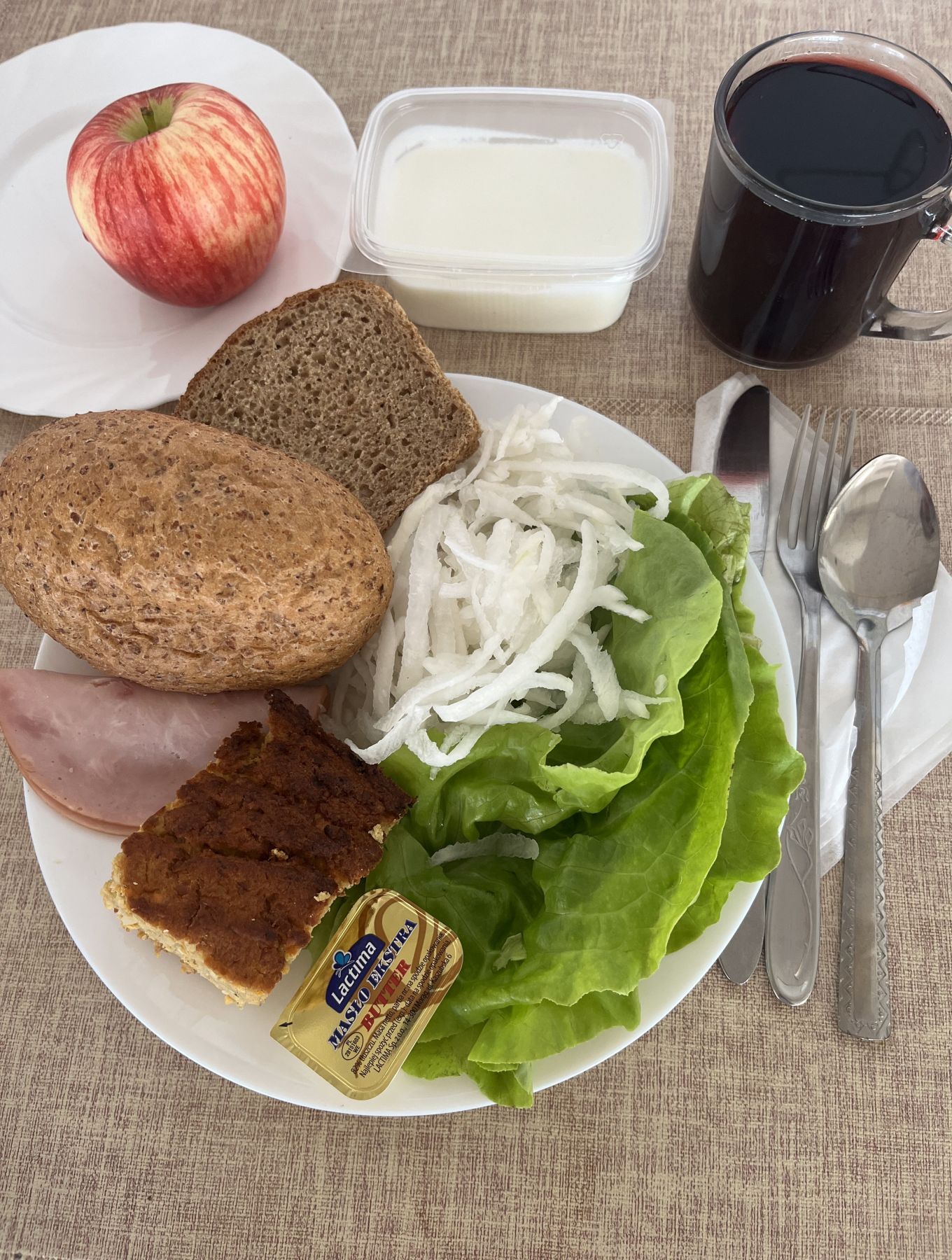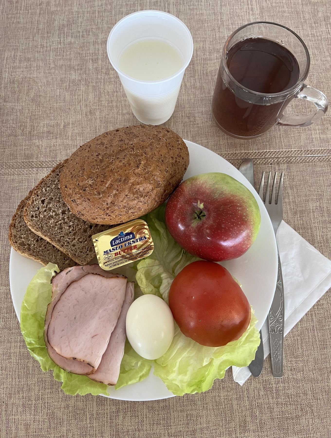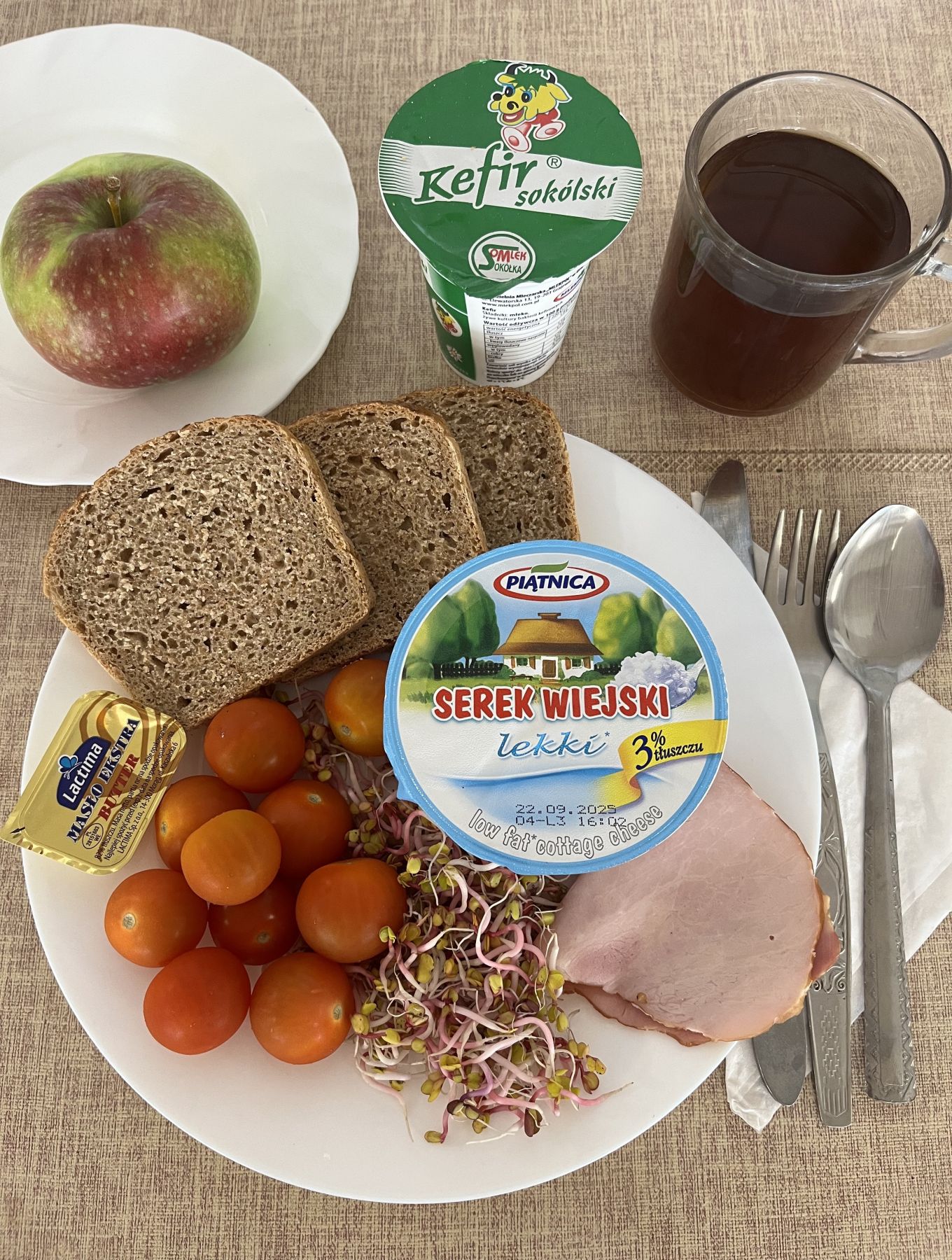 Kefir 2% tł 150 g 1 szt (MLE) Chleb razowy żytnio-pszenny 120 g (GLU PSZ, GLU ŻYT) Masło extra 82% 10 g (MLE) Szynkowa drobiowa - produkt drobiowy, grubo rozdrob., wędzony, parzony 30 g Serek a'la fromage z ziołami 80 g (MLE) Sałata zielona 30 g Herbata czarna granulowana b/c 250 ml II śniadanie Jabłko 150 g |