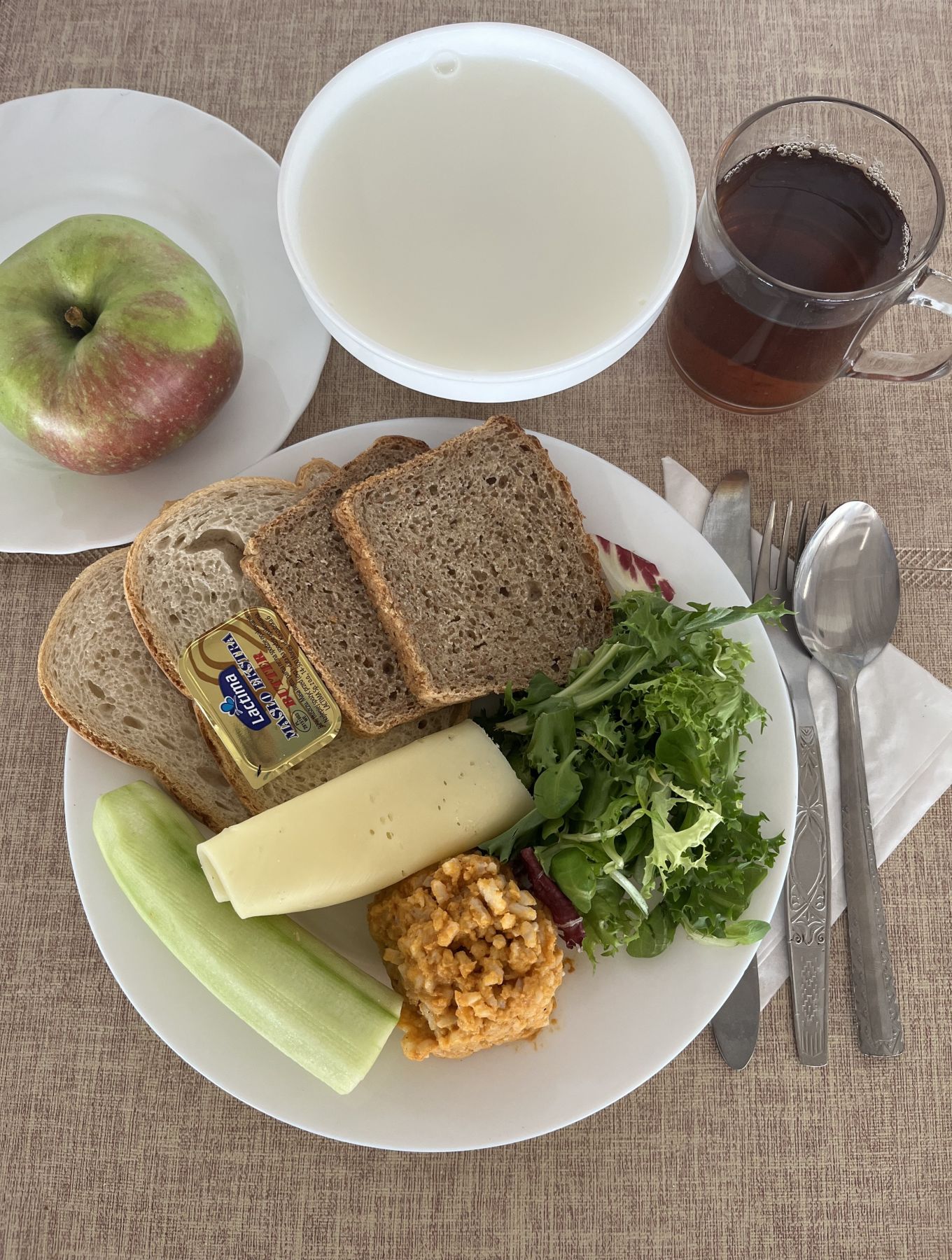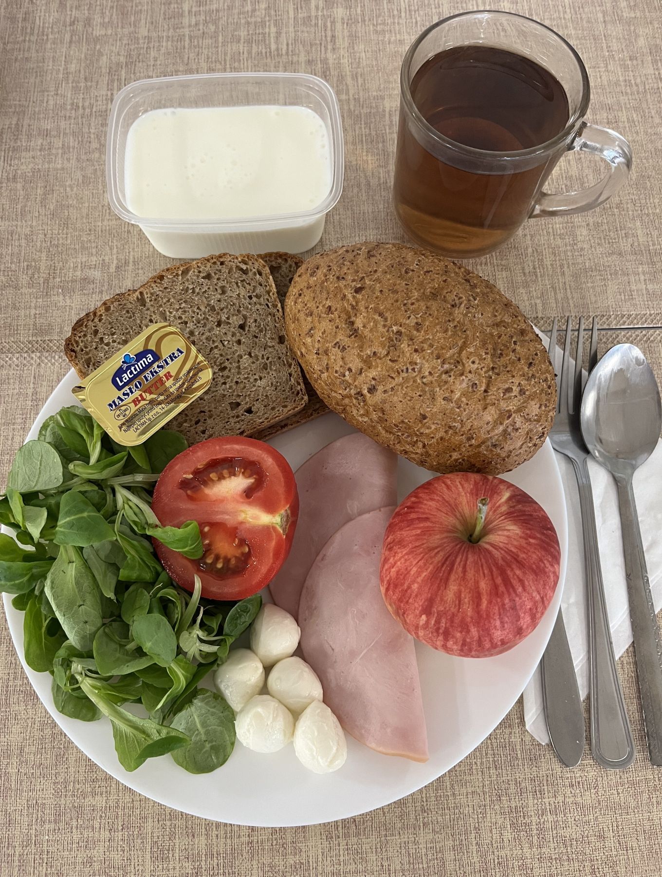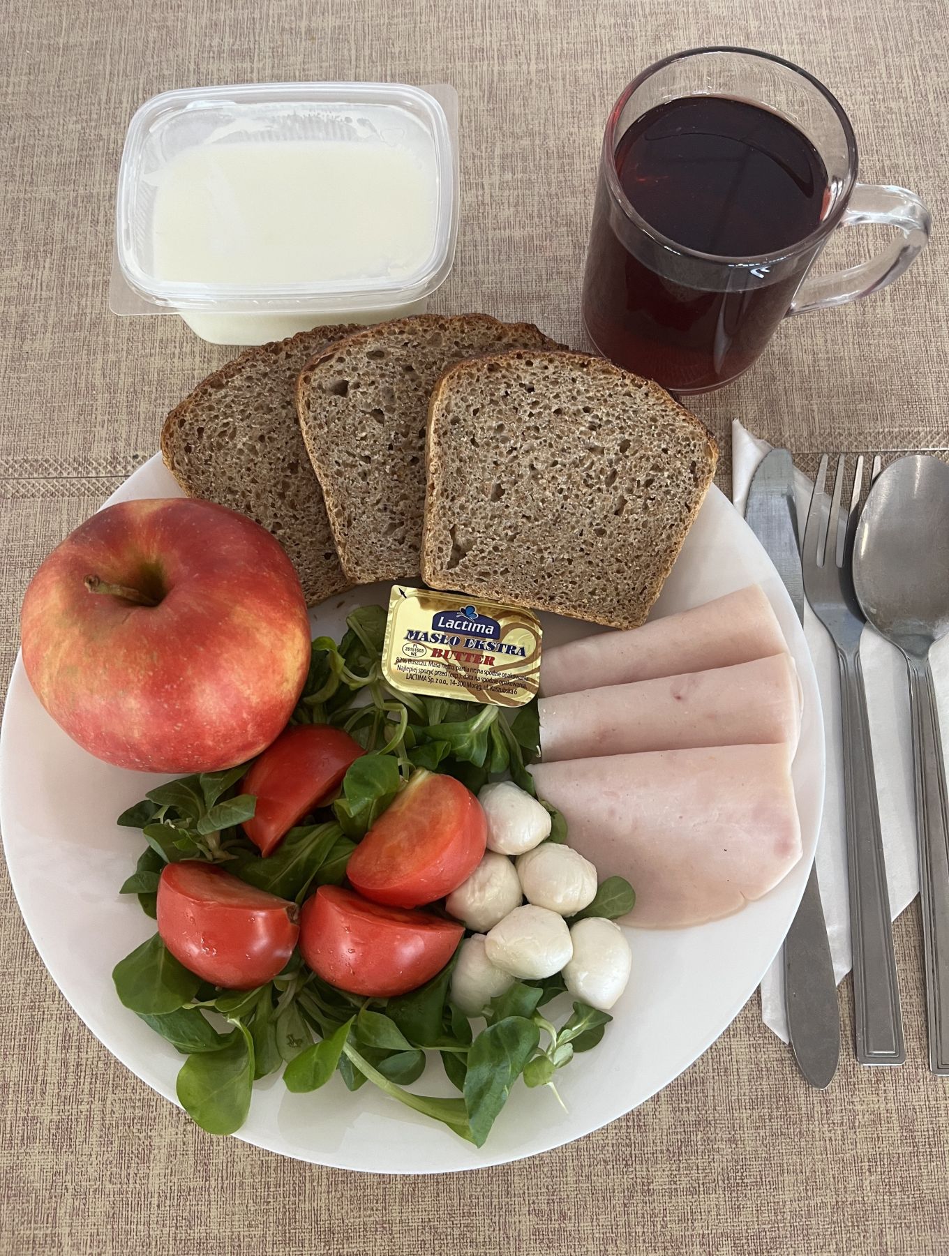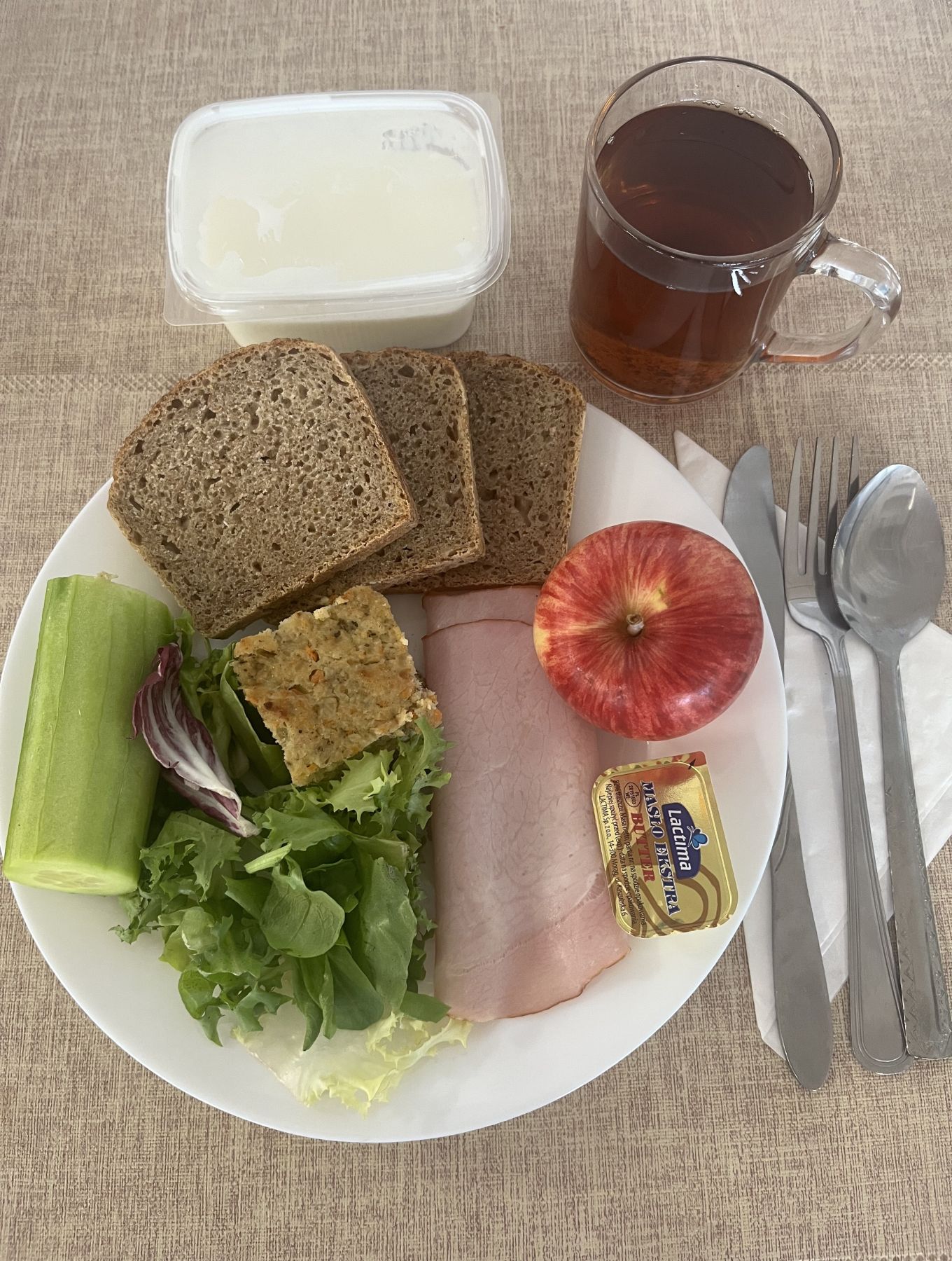 Kefir 2% tł 150 g 1 szt (MLE) Chleb razowy żytnio-pszenny 120 g (GLU PSZ, GLU ŻYT) Masło extra 82% 10 g (MLE) Szynkowa drobiowa - produkt drobiowy, grubo rozdrob., wędzony, parzony 30 g Serek a'la fromage z ziołami 80 g (MLE) Sałata zielona 30 g Herbata czarna granulowana b/c 250 ml II śniadanie Jabłko 150 g |
