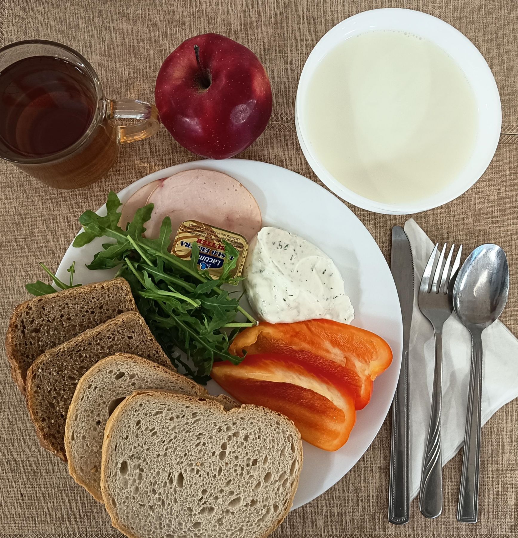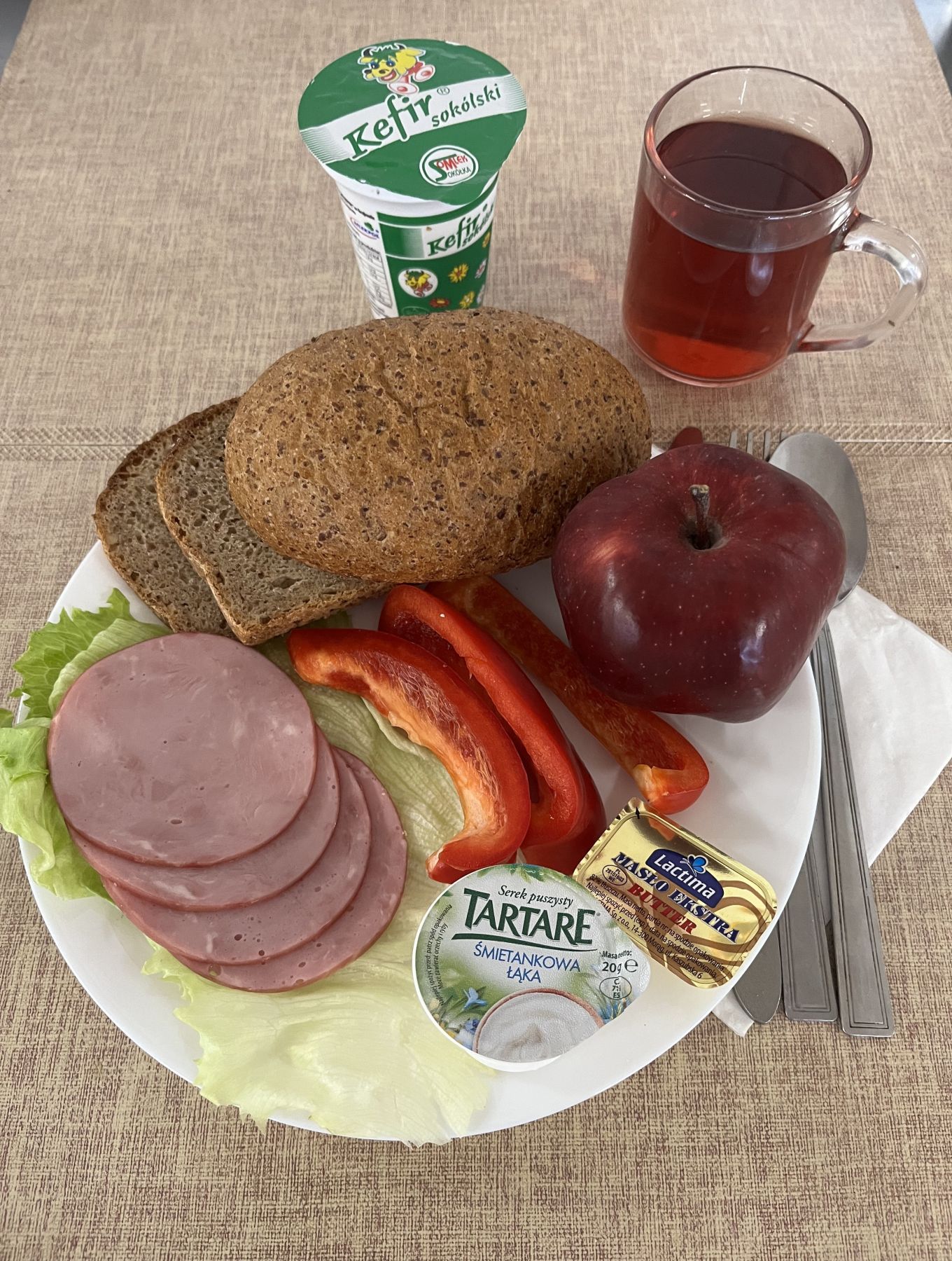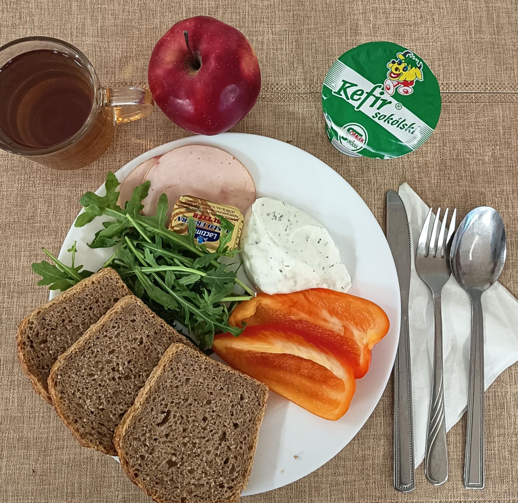 Kefir 2% tł 150 ml (MLE) Chleb razowy żytnio-pszenny 120 g (GLU PSZ, GLU ŻYT) Masło extra 82% 10g (MLE) Śniadaniowa drobiowa - produkt drobiowy, parzony w osłonce niejadalnej 50 g (SOJ) Pasta z twarogu z koperkiem 80 g (MLE) Papryka świeża 70 g Herbata czarna granulowana b/c 250 ml II śniadanie Jabłko 150 g |