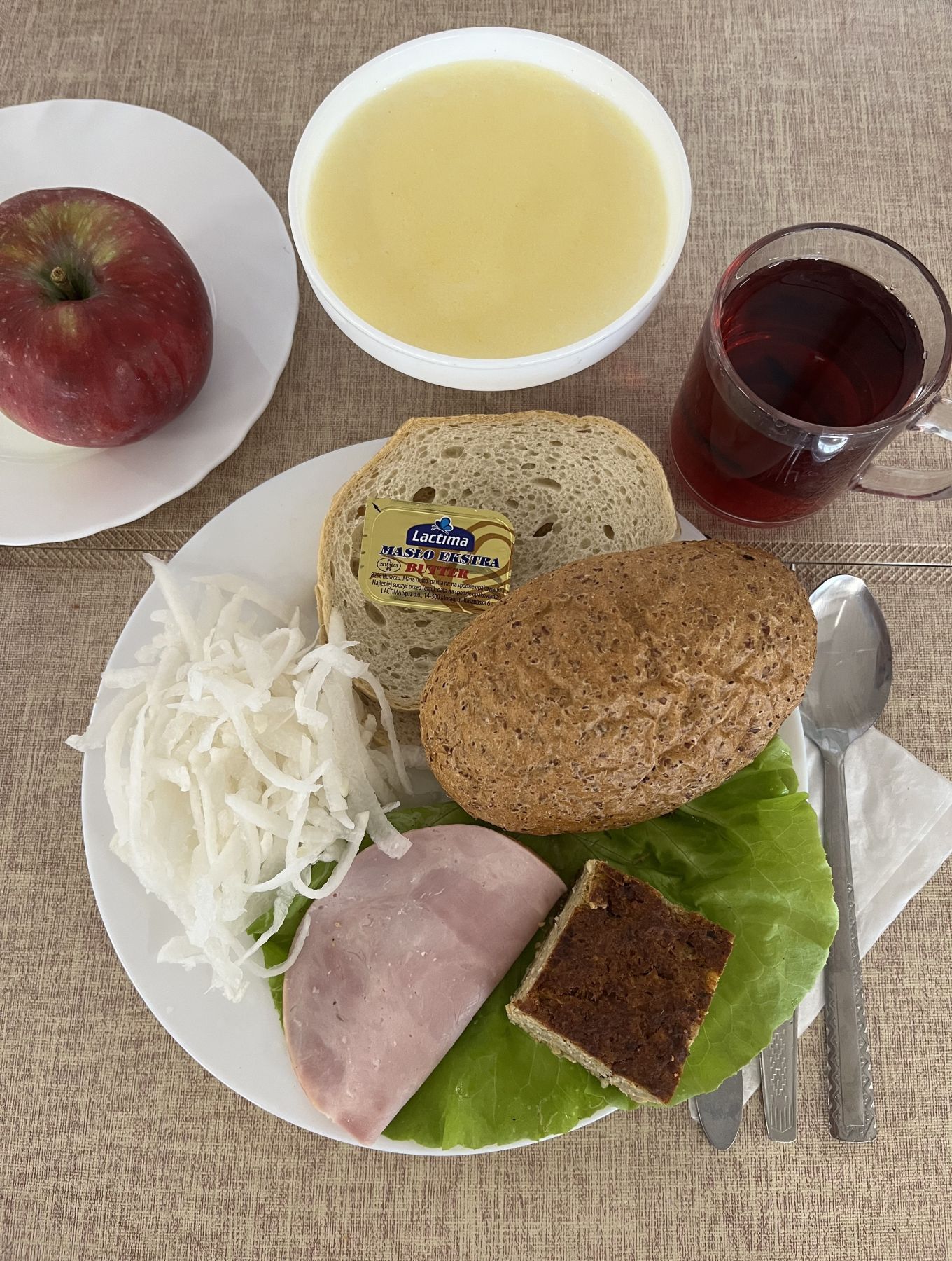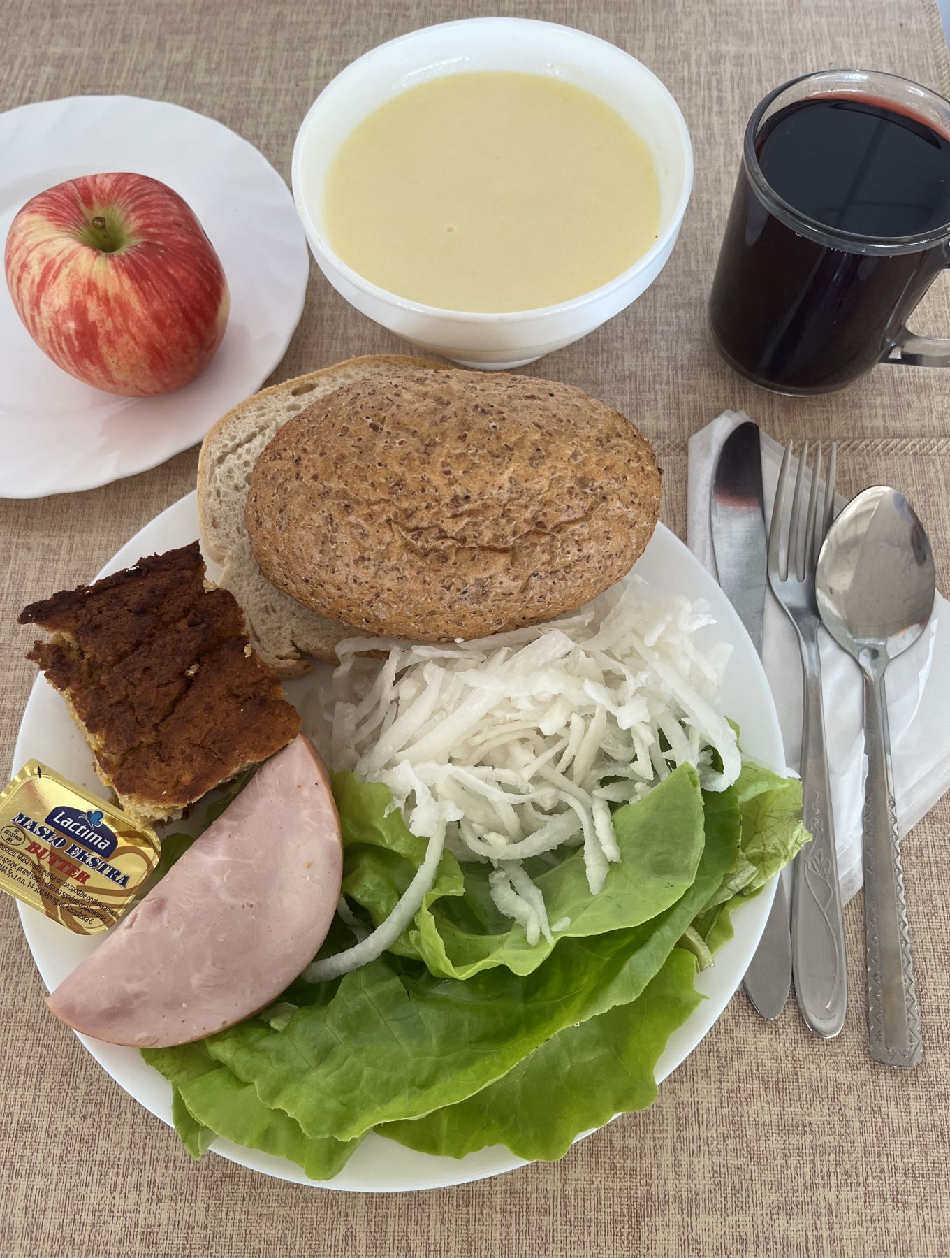 Kasza kukurydziana na mleku 300 ml (MLE) Chleb mieszany pszenno-żytni 70 g (GLU PSZ, GLU ŻYT) Bułka pszenna długa krojona 50 g (GLU PSZ) Masło extra 82% 10 g (MLE) Szynkowa dębowa kieł. wp. gr. rozd. wędz. parz. z dod. wody w osł. niejad. 25 g Pasta mięsno-warzywna z mięsa wieprzowego 80 g (SEL) Sałata zielona 30 g Herbata czarna granulowana z/c 250 ml Jabłko pieczone 150 g |