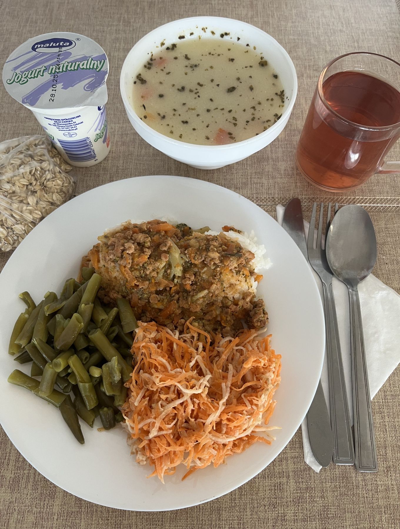| DIETA PODSTAWOWA Barszcz ukraiński z ziemniakami 300 ml (GLU PSZ, MLE, SEL) Sos jogurtowy naturalny 80 g (MLE) Ryż z jabłkiem prażonym i cynamonem 300 g Woda mineralna n/g 0,5l 1 szt |