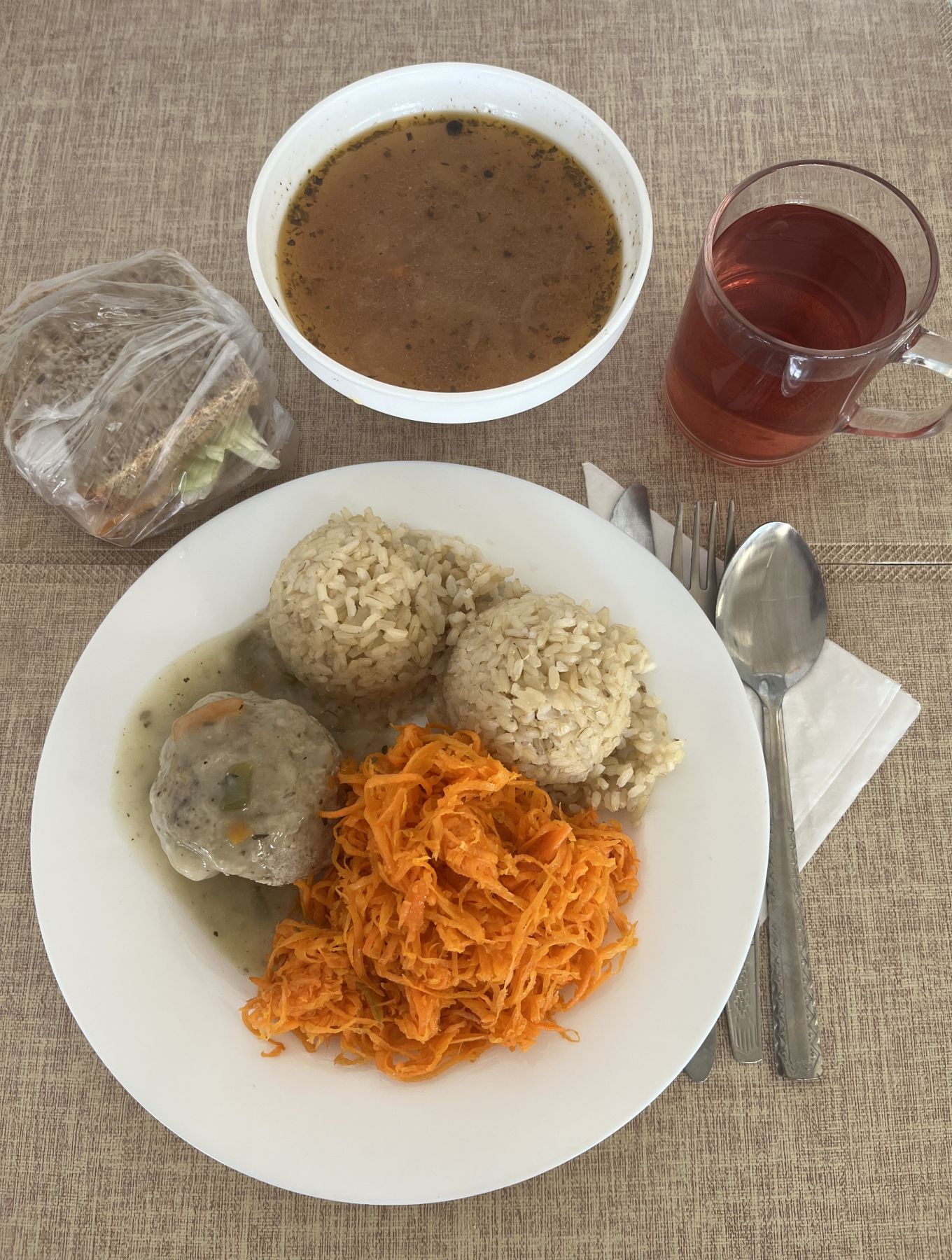 Kasza jaglana na sypko 180 g Pieczeń rzymska wieprzowa 100 g (GLU PSZ, JAJ) Sos ziołowy 80 ml (GLU PSZ, SEL) Marchew oprószana z olejem 200 g (GLU PSZ) Kompot z aronii i czerwonej porzeczki z/c 250 ml |