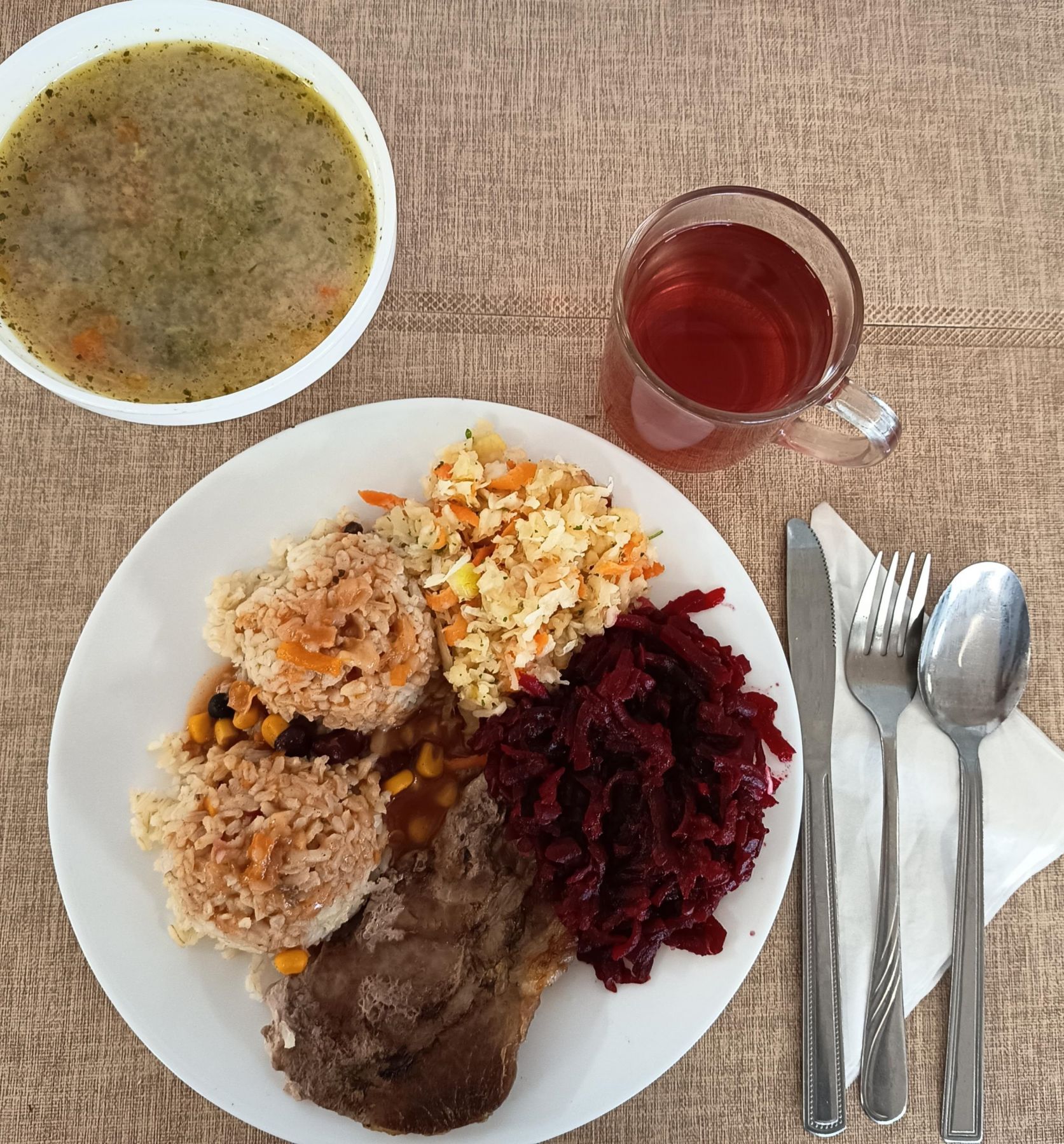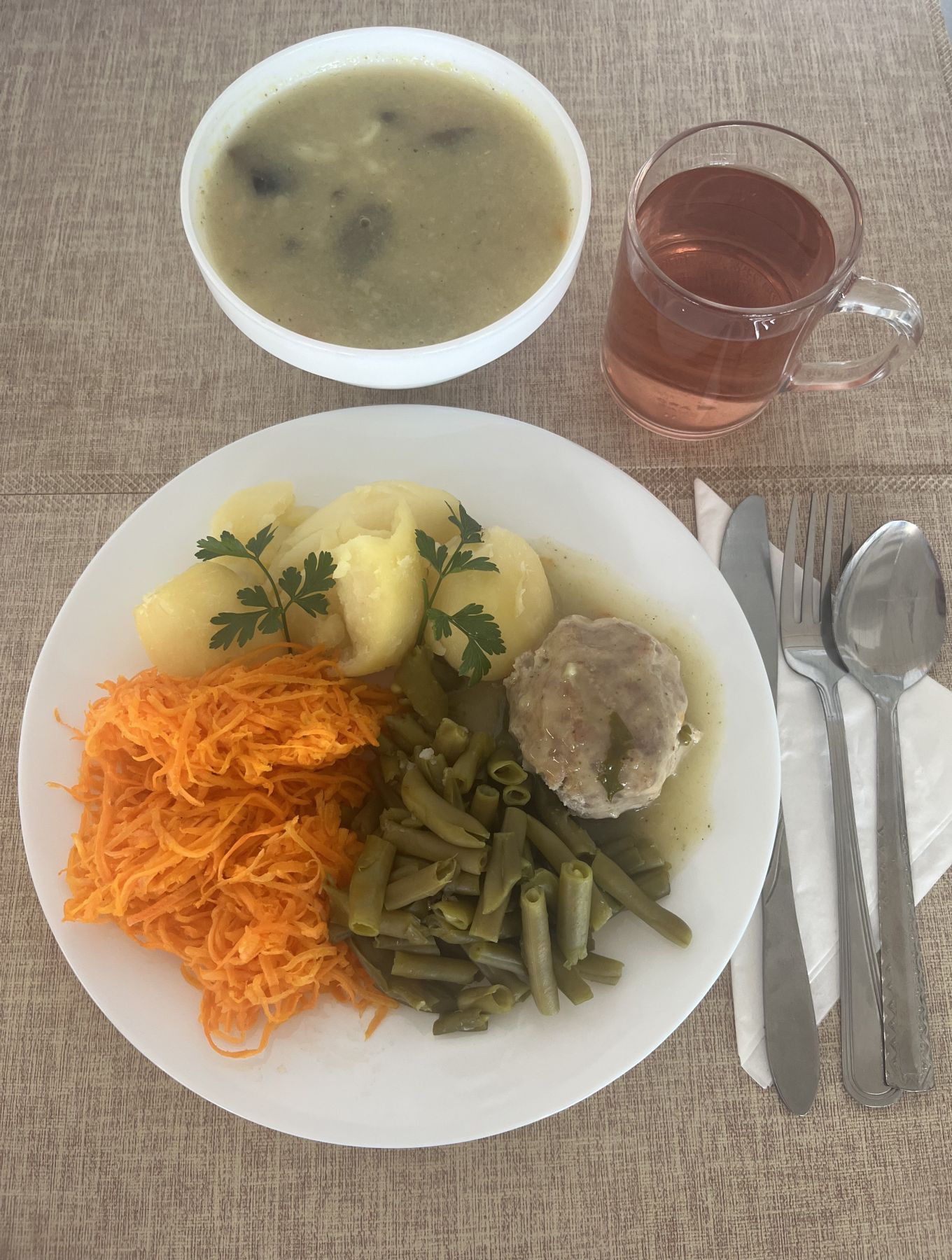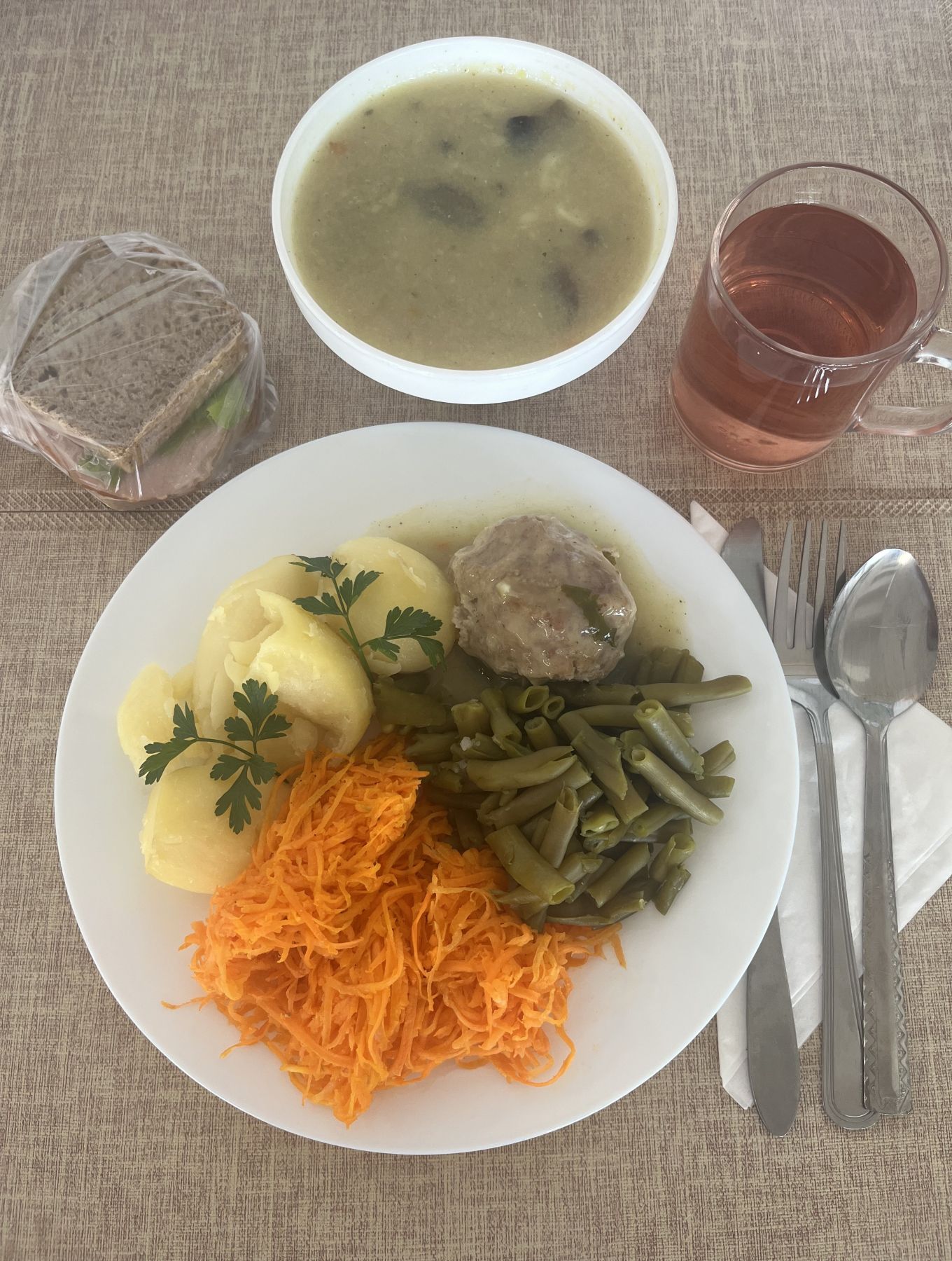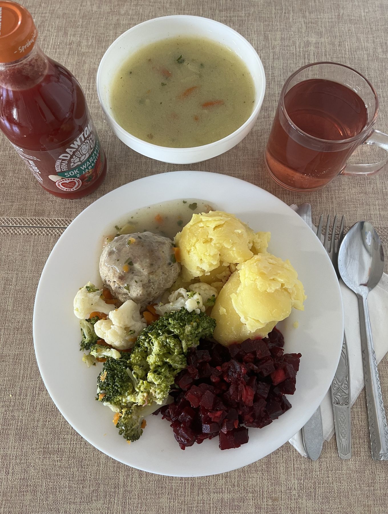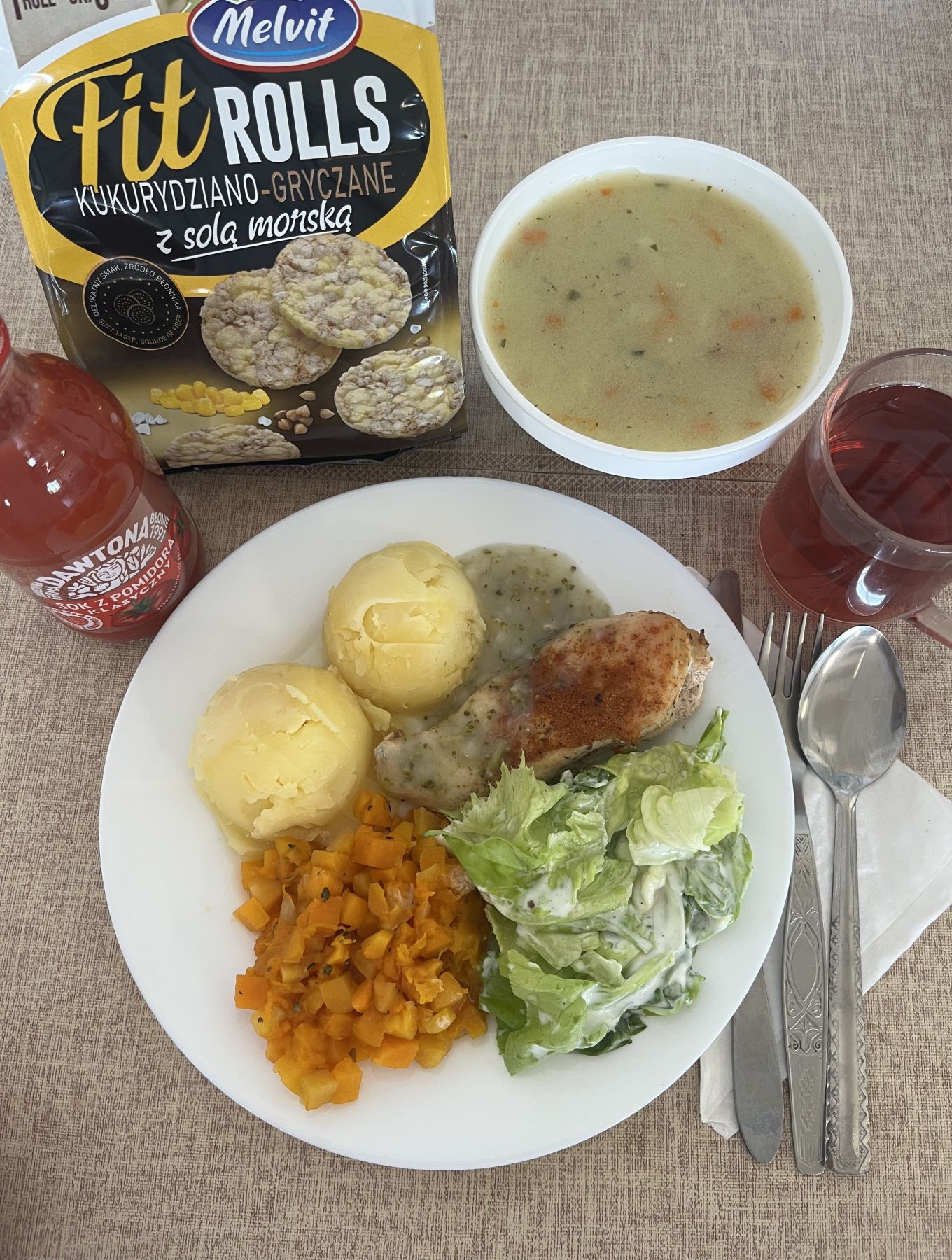 Ziemniaki 180 g Zrazik drobiowy z udźca pieczony mielony 100 g (GLU PSZ, JAJ) Sos jarzynowy 80 ml (GLU PSZ, SEL) Buraczki gotowane 200 g Woda mineralna n/g 0,5l 1 szt |