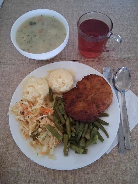 | DIETA PODSTAWOWA Jarzynowa z zacierką 300 ml (GLU PSZ, JAJ, MLE, SEL) Ziemniaki 180 g Kotlet drobiowy panierowany 100 g (GLU PSZ, JAJ) Surówka wykwintna z olejem b/c 200 g (JAJ, GOR) Kompot z aronii i czerwonej porzeczki z/c 250 ml |