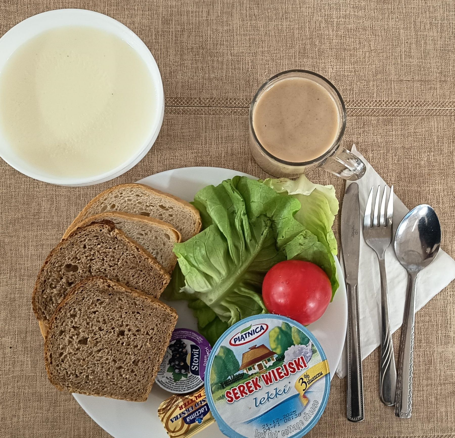 | DIETA PODSTAWOWA Płatki pszenne na mleku 300 ml (GLU PSZ, MLE) Chleb mieszany pszenno-żytni 70 g (GLU PSZ, GLU ŻYT) Chleb razowy żytnio-pszenny 50 g (GLU PSZ, GLU ŻYT) Masło extra 82% 10g (MLE) Dżem 25 g 1 szt Twarożek 50 g (MLE) Pomidor 50 g Sałata zielona 20 g Kawa zbożowa z mlekiem 250 ml (MLE, GLU ŻYT, GLU JĘCZ) Banan 150 g |