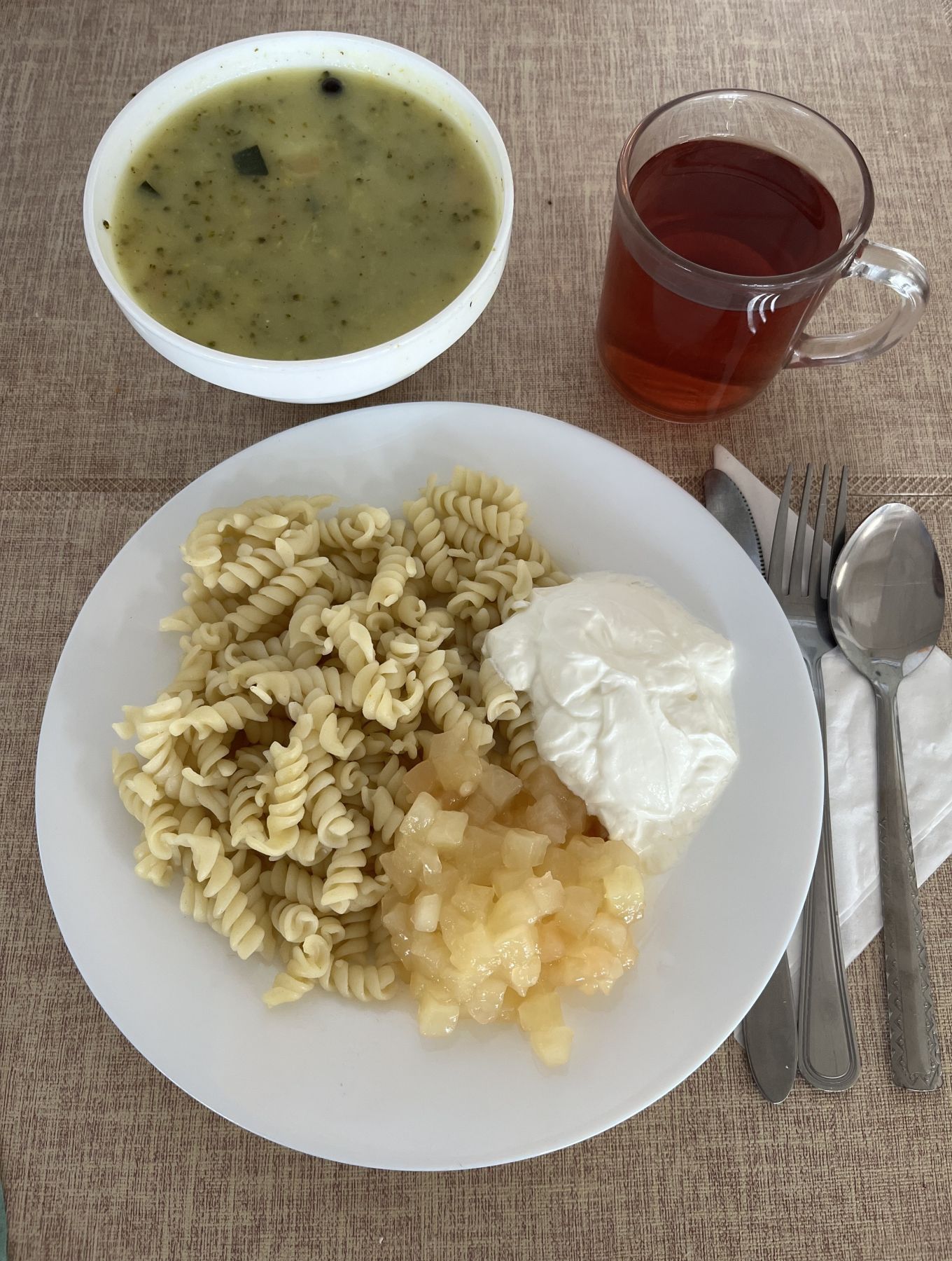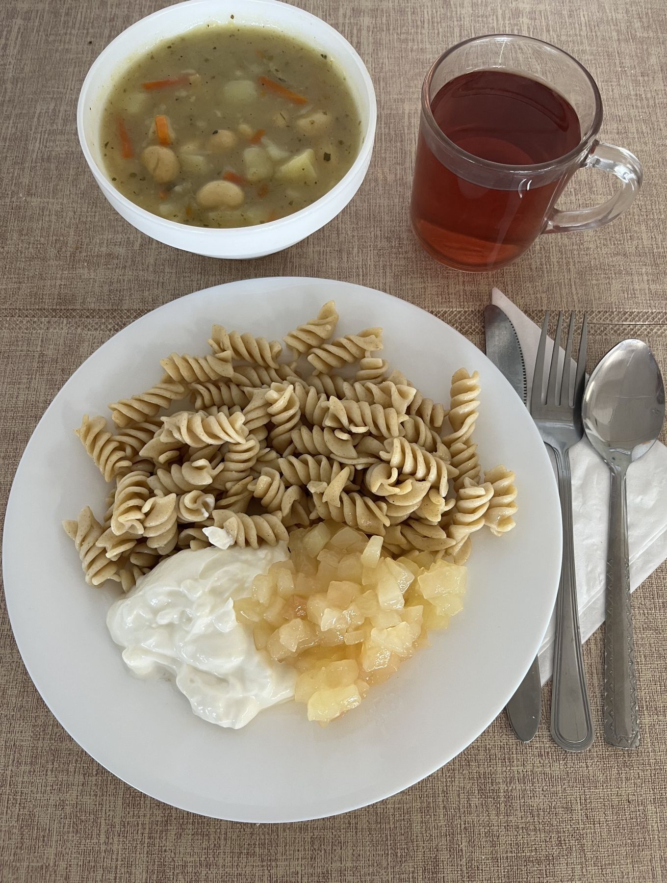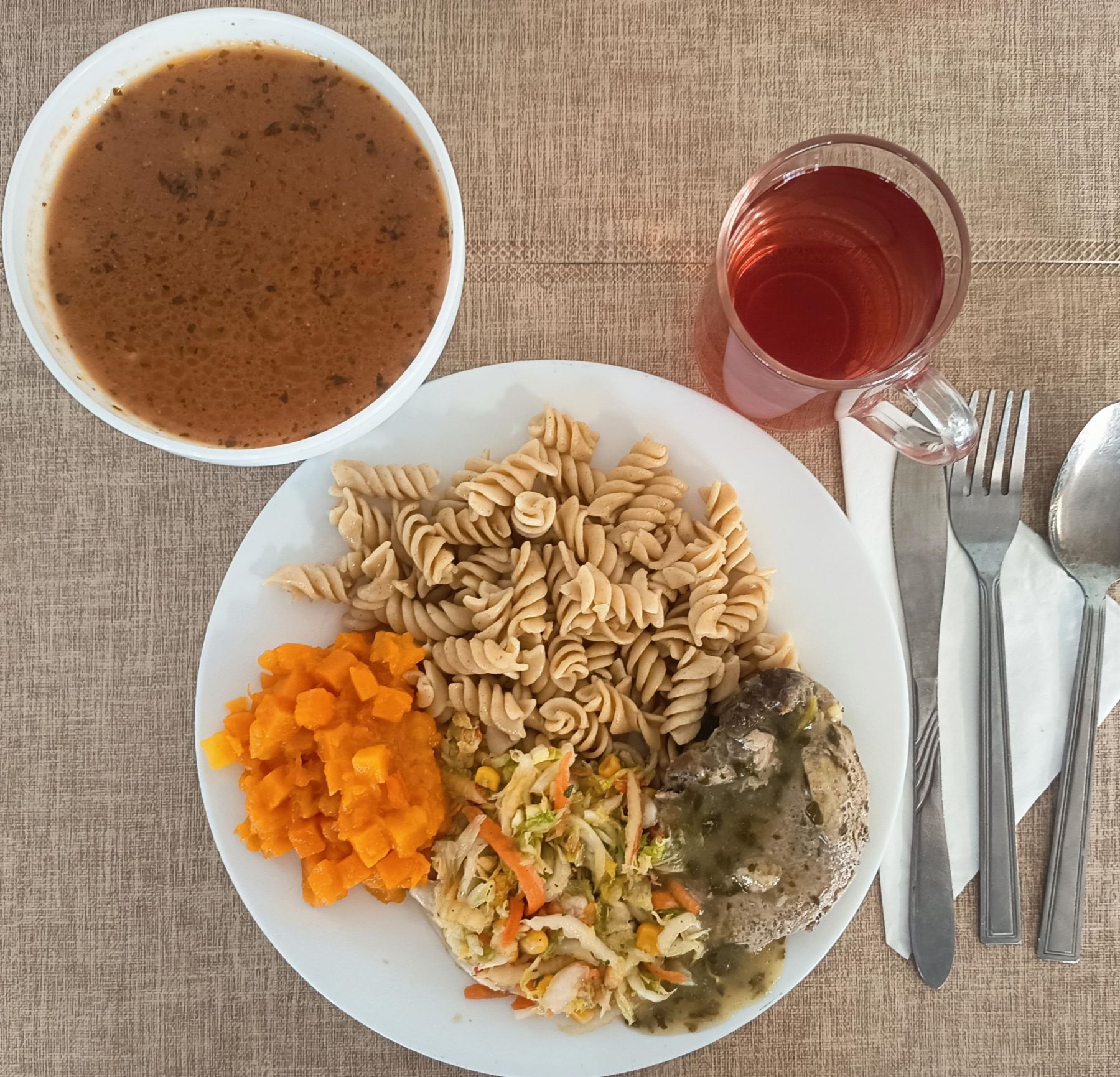 Makaron pełnoziarnisty 180 g (GLU PSZ) Szynka wieprzowa gotowana 100 g Sos szpinakowy 80 ml (GLU PSZ) Surówka z kapusty pekińskiej z olejem 200 g Kompot z aronii i czerwonej porzeczki b/c 250 ml |