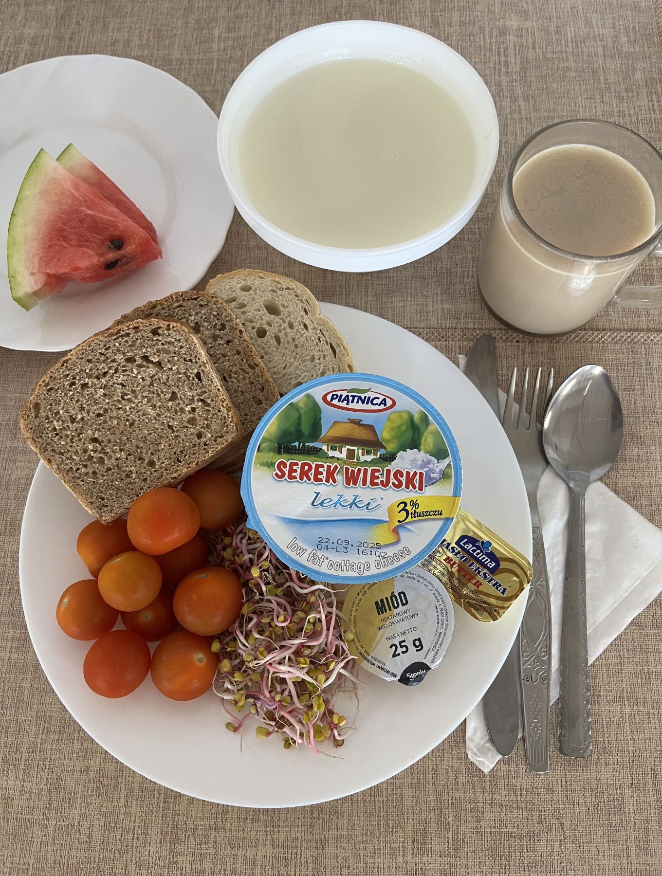 Zacierka na mleku 300 ml (GLU PSZ, JAJ, MLE) Chleb mieszany pszenno-żytni 70 g (GLU PSZ, GLU ŻYT) Bułka pszenna długa krojona 50 g (GLU PSZ) Masło extra 82% 10 g (MLE) Szynkowa dębowa drobiowa kiełbasa grubo rozdrobniona 25 g Twarożek 50g (MLE) Pomidor b/skórki 70 g Herbata czarna granulowana z/c 250 ml II Śniadanie