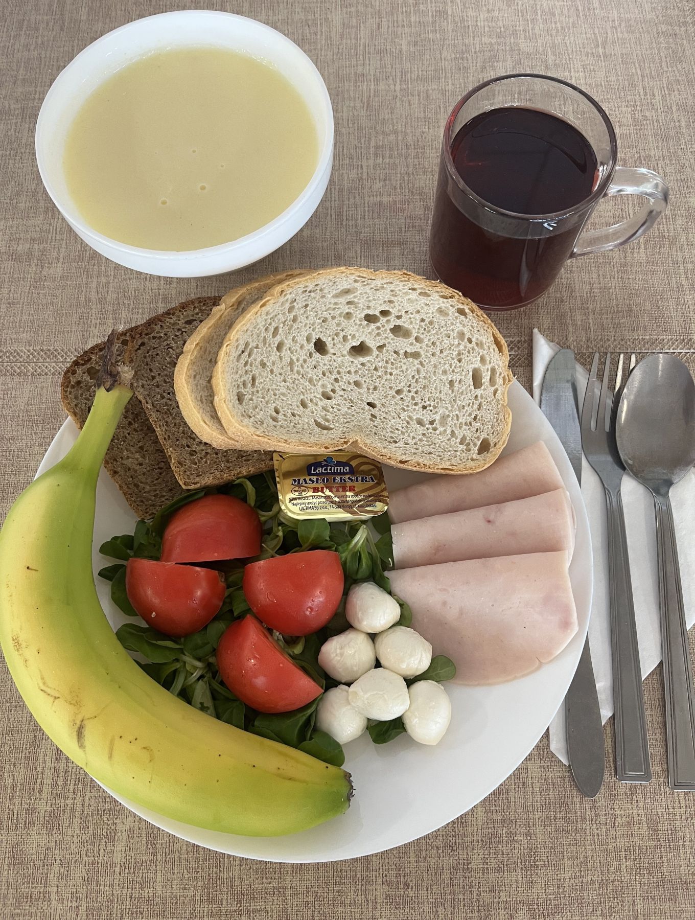 | DIETA PODSTAWOWA Kasza kukurydziana na mleku 300 ml (MLE) Chleb mieszany pszenno-żytni 70 g (GLU PSZ, GLU ŻYT) Chleb razowy żytnio-pszenny 50 g (GLU PSZ, GLU ŻYT) Masło extra 82% 10g (MLE) Pasta z twarogu i siemienia z natką pietruszki 80 g (MLE) Baton szynkowy z kurcząt 25 g Ogórek kiszony 50 g Sałata zielona 20 g Herbata czarna granulowana z/c 250 ml Banan 150 g |