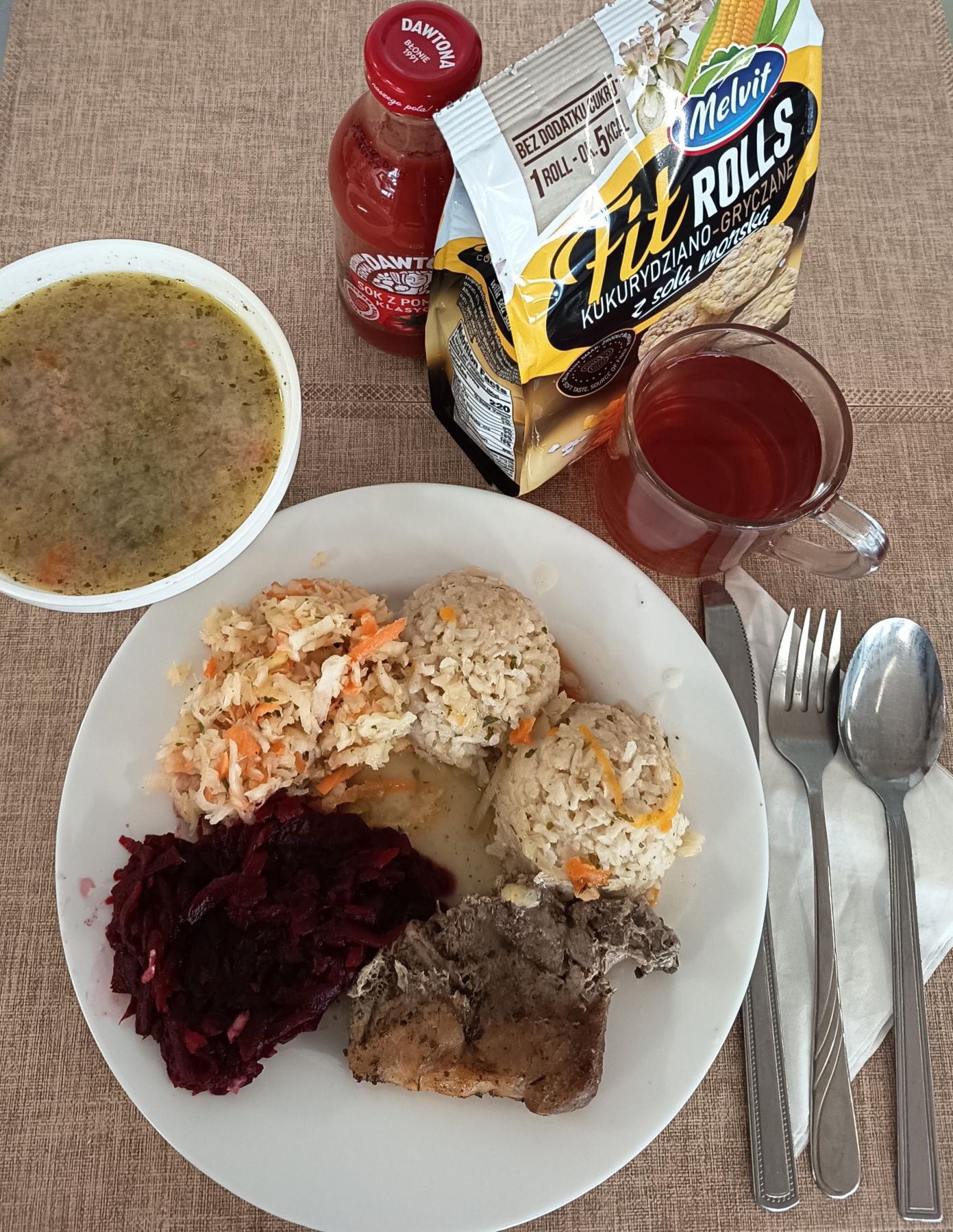| DIETA PODSTAWOWA Barszcz biały z ziemniakami 300 ml ( GLU PSZ, MLE, SEL, GLU ŻYT) Risotto z mięsem wieprz i warzywami 300g (SEL) Sos pomidorowy 80 ml (GLU PSZ) Brokuł gotowany 200 g Kompot z aronii i czerwonej porzeczki*z/c 250 ml |