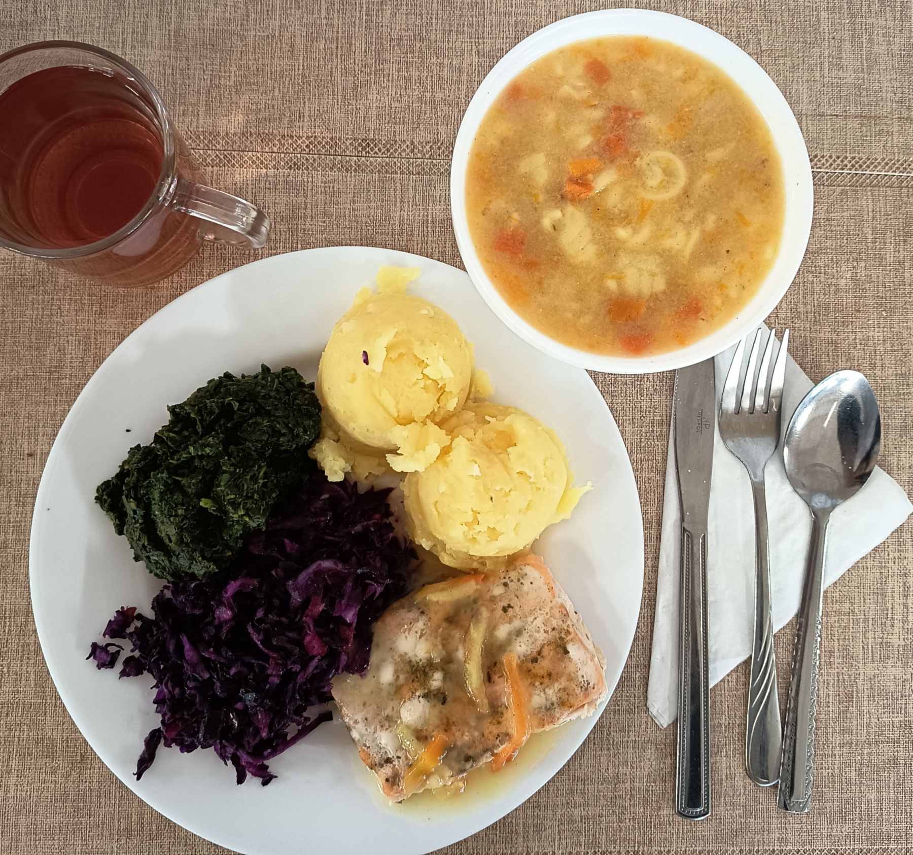 | DIETA PODSTAWOWA Dyniowa z makaronem 300 ml (GLU PSZ, MLE, SEL) Ziemniaki 180 g Kotlet mielony z ryby (Miruna) 100 g (GLU PSZ, JAJ, RYB)** Surówka z kapusty czerwonej z olejem 200 g Kompot z aronii i czerwonej porzeczki z/c 250 ml |