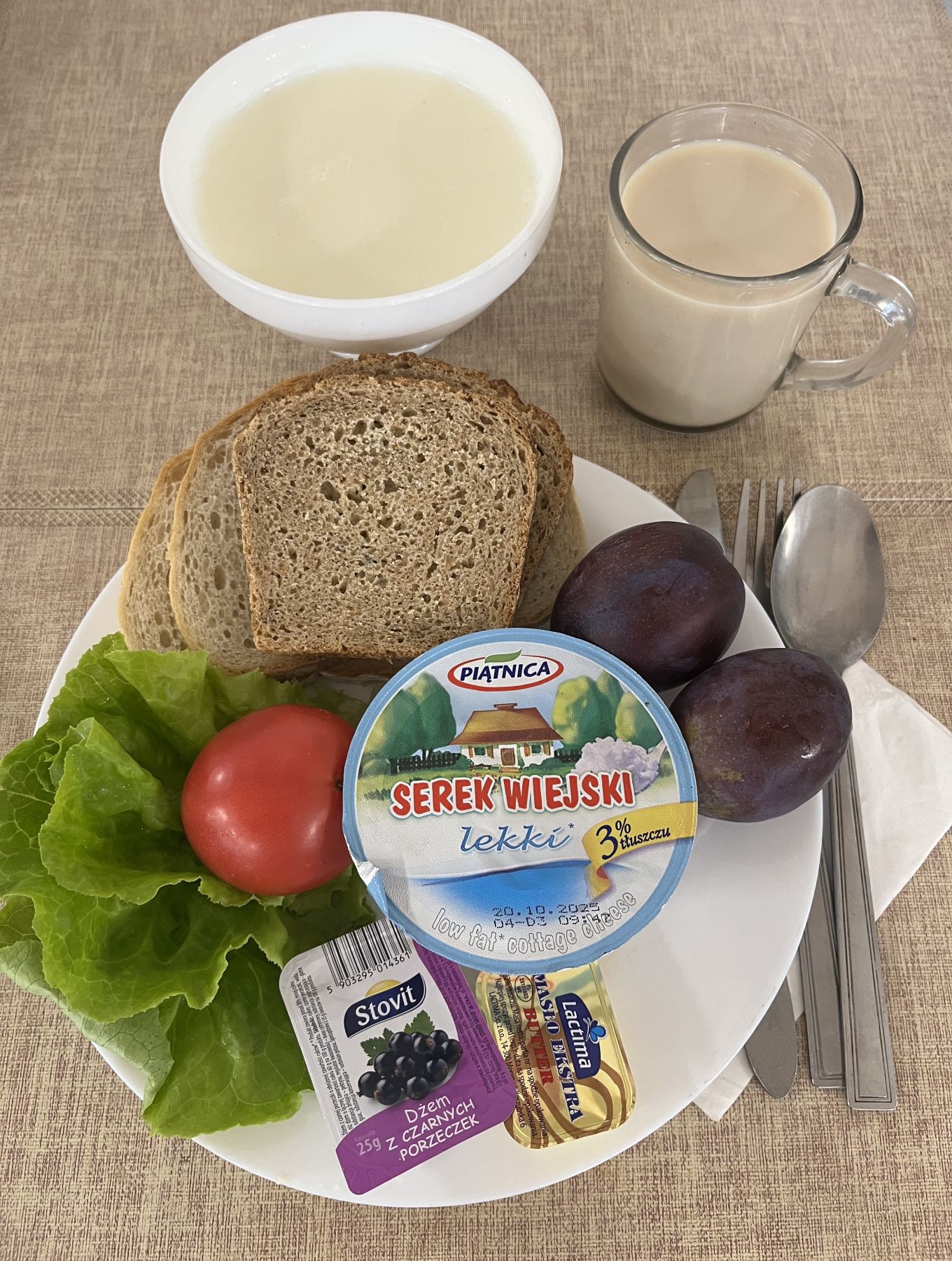 | DIETA PODSTAWOWA Kasza kukurydziana na mleku 300 ml (MLE) Chleb mieszany pszenno-żytni 70 g (GLU PSZ, GLU ŻYT) Chleb razowy żytnio-pszenny 50 g (GLU PSZ, GLU ŻYT) Masło extra 82% 10 g (MLE) Śniadaniowa drobiowa - produkt drobiowy,parzony w osłonce niejadalnej 50 g (SOJ) Sałatka jarzynowa 200 g (JAJ, MLE, SEL, GOR) Herbata czarna granulowana z/c 250 ml Śliwka 2 szt |
