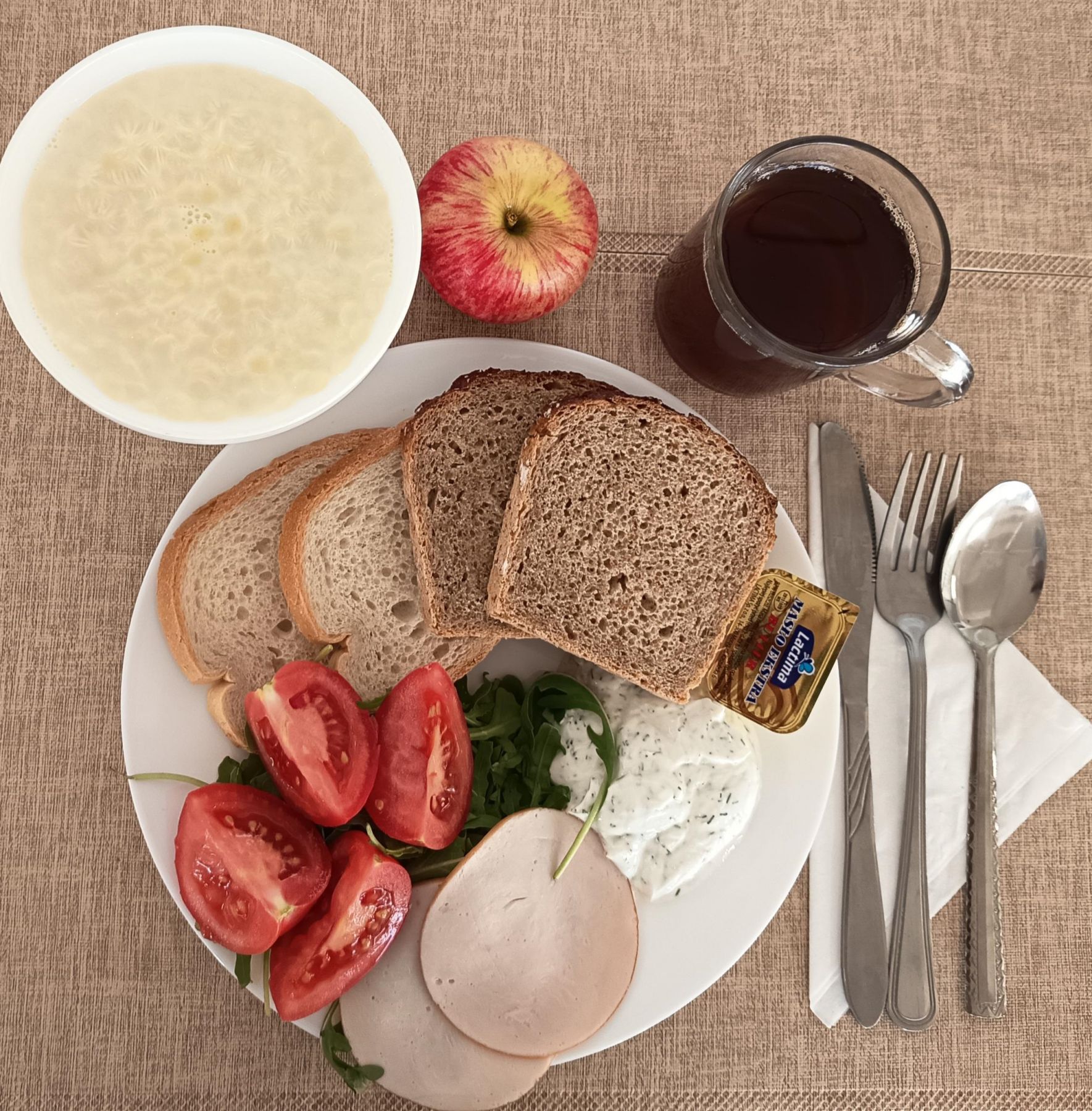 Płatki owsiane na mleku 300 ml (MLE, GLU OW) Chleb mieszany pszenno-żytni 70 g (GLU PSZ, GLU ŻYT) Bułka pszenna długa krojona 50 g (GLU PSZ) Masło extra 82% 10g (MLE) Szynka zielonogórska - wp. parzona 30 g (SOJ) Szynka z piersią indyczą - wędlina drobiowa grubo rozdrobniona, parzona, w osłonce niejadalnej 50 g (SOJ, SEL) Sałata zielona 30 g Herbata czarna granulowana z/c 250 ml Jabłko pieczone 150 g