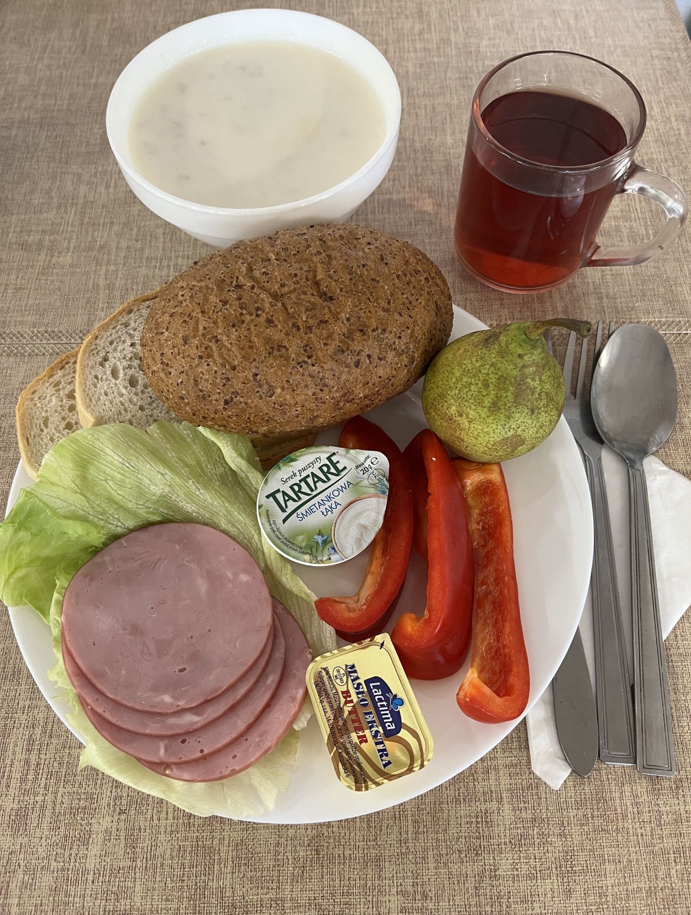 Maślanka 150 ml (MLE) Chleb razowy żytnio-pszenny 120 g (GLU PSZ, GLU ŻYT) Masło extra 82% 10 g (MLE) Pasta z twarogu i siemienia z natką pietruszki 80 g (MLE) Baton szynkowy z kurcząt 25 g Ogórek kiszony 70 g Herbata czarna granulowana b/c 250 ml II Śniadanie Gruszka 150 g |